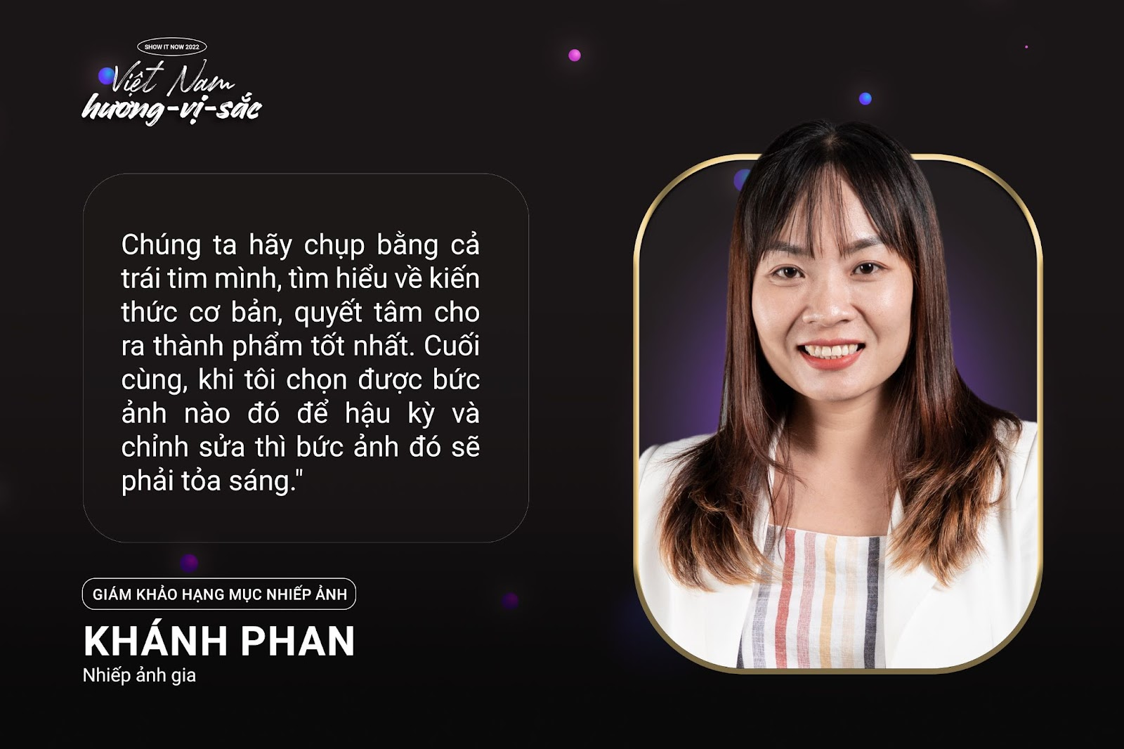 Đồng tình với quan điểm trên, nhiếp ảnh gia Khánh Phan – Giám khảo hạng mục Nhiếp Ảnh cũng cho biết thêm: “Việt Nam là một trong những quốc gia Châu Á có chất liệu văn hóa đa sắc màu. Chúng ta có 54 dân tộc anh em, mỗi dân tộc mang đến những sắc màu rất riêng, sự khác biệt vùng miền đó chính là chất liệu tuyệt vời.” Sau nhiều năm cầm máy rong ruổi khắp mọi miền trên giải đất hình chữ S, theo chị, thành công của nhiếp ảnh là mang những khoảnh khắc đời thường vào tác phẩm để phục vụ cuộc sống: “Nhiếp ảnh là mọi hoạt động thường ngày. Siêu phẩm không ở đâu xa, nó ở ngay bên cạnh bạn, quan trọng là bạn có nhìn ra hay không.”
