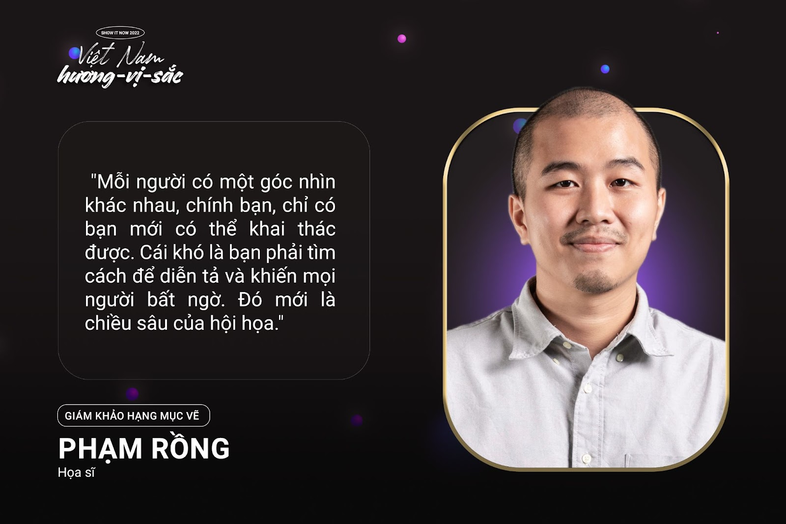 Vốn nổi tiếng với những bộ tranh minh họa mang đậm hơi thở văn hóa, Họa sĩ Phạm Rồng – Giám khảo hạng mục Vẽ cho biết: “Một trong những ưu điểm khi sáng tạo tác phẩm từ văn hóa Việt Nam chính là chúng ta hiểu về nó nên sẽ có những góc nhìn rất riêng biệt. Chính những điều gần gũi, giản đơn đó lại chính là điểm nhấn khiến bạn bè quốc tế trầm trồ, mỗi người có một câu chuyện văn hóa khác nhau, lúc đó bản sắc của chúng ta sẽ thực sự tỏa sáng.”
