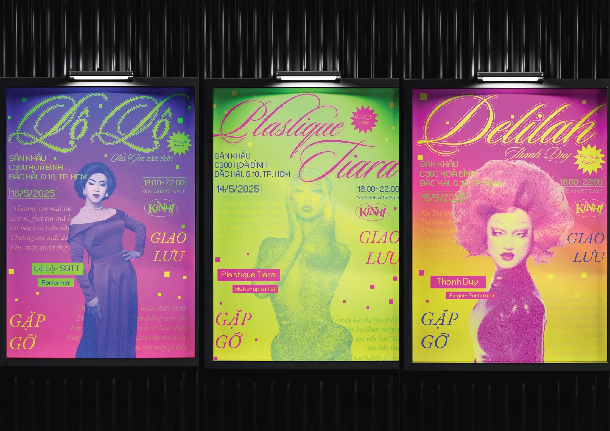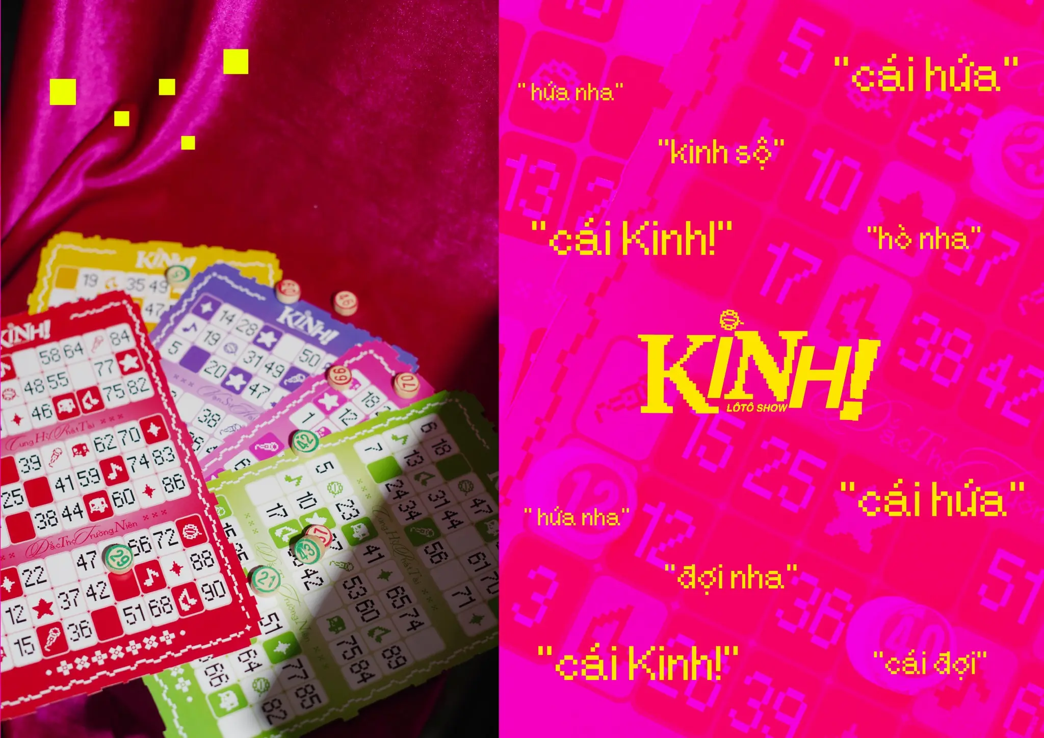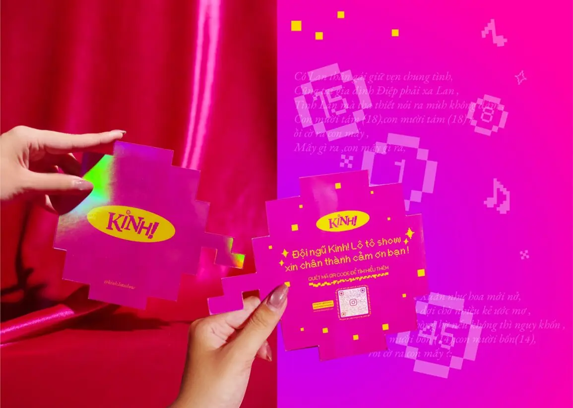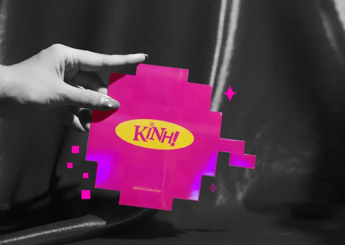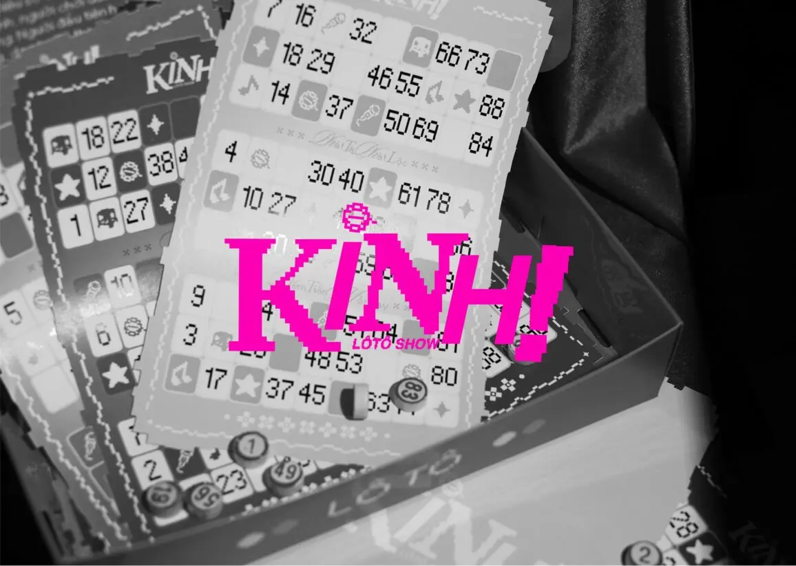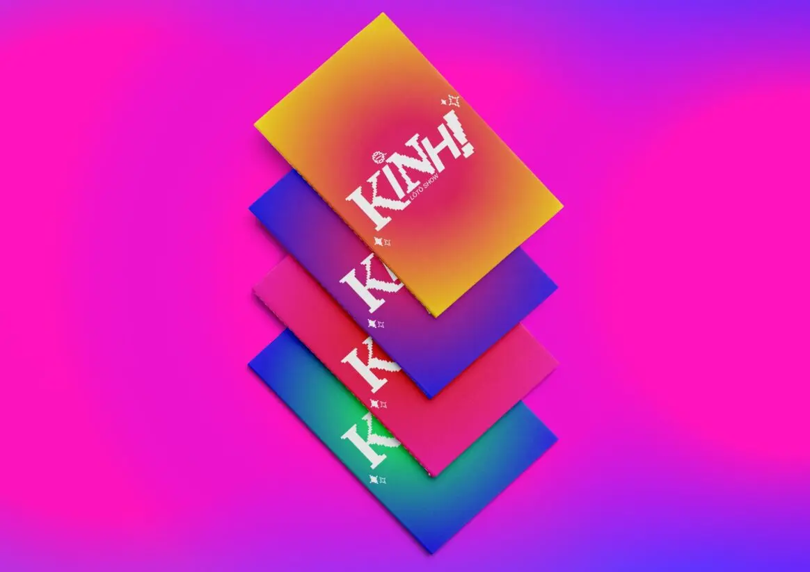“KINH! LôTô Show” gây ấn tượng bởi cách tiếp cận di sản đầy mới mẻ và táo bạo. Lấy cảm hứng từ tiếng hô “KINH!” đầy phấn khích khi người chơi thắng giải, tên thương hiệu gói trọn niềm vui và không khí hội hè đặc trưng. Dự án sử dụng phong cách Pixel (8-bit) gợi nhớ trò chơi điện tử cổ điển, kết hợp cùng bảng màu Neon (Vàng, Hồng, Xanh) rực rỡ tái hiện ánh đèn sân khấu. Tổng thể tạo nên sự giao thoa thú vị giữa nét dân gian và phong cách 4.0.