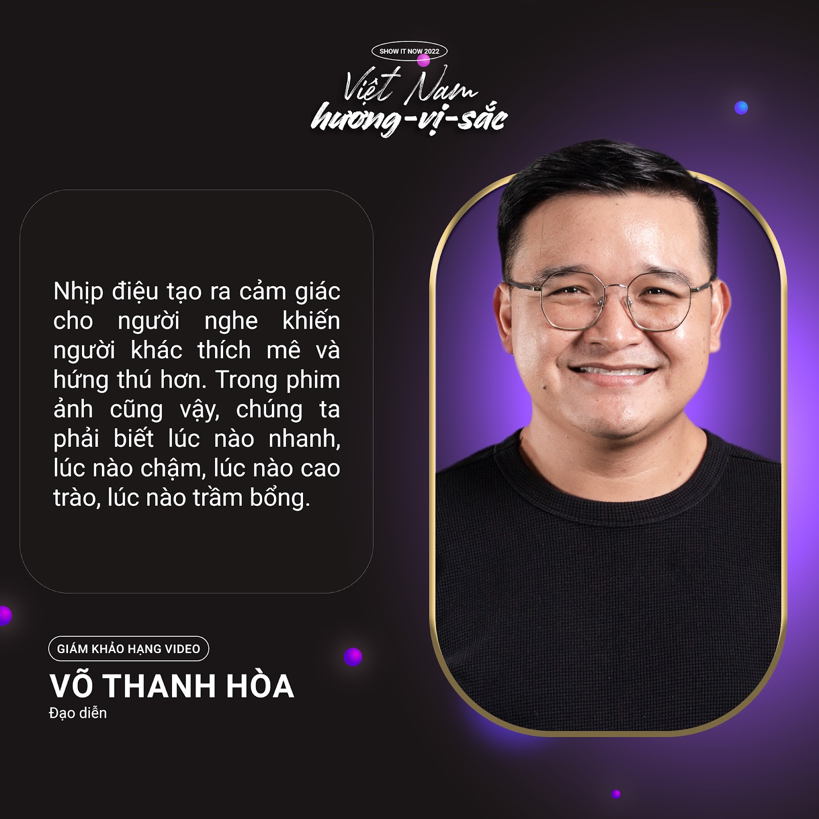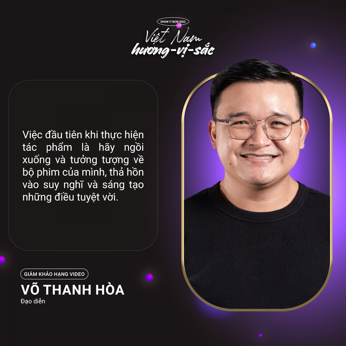 Đạo diễn Võ Thanh Hòa: “Tuy mỗi năm một chủ đề nhưng “Show It NOW” vẫn luôn là tiêu chí quan trọng nhất mà cuộc thi sáng tạo này hướng đến. Hãy Show Yourself – Các bạn là ai, các bạn muốn làm gì trong cuộc sống nghệ thuật này. Hương – Vị – Sắc là ba thành tố mà chúng ta có thể dùng cả năm giác quan để cảm thụ và thể hiện nó qua đa dạng hình thức. Chúng tôi rất mong chờ để cảm thụ những điều đó chung với các bạn, điều đó mới là chân ái của cuộc thi năm nay.”