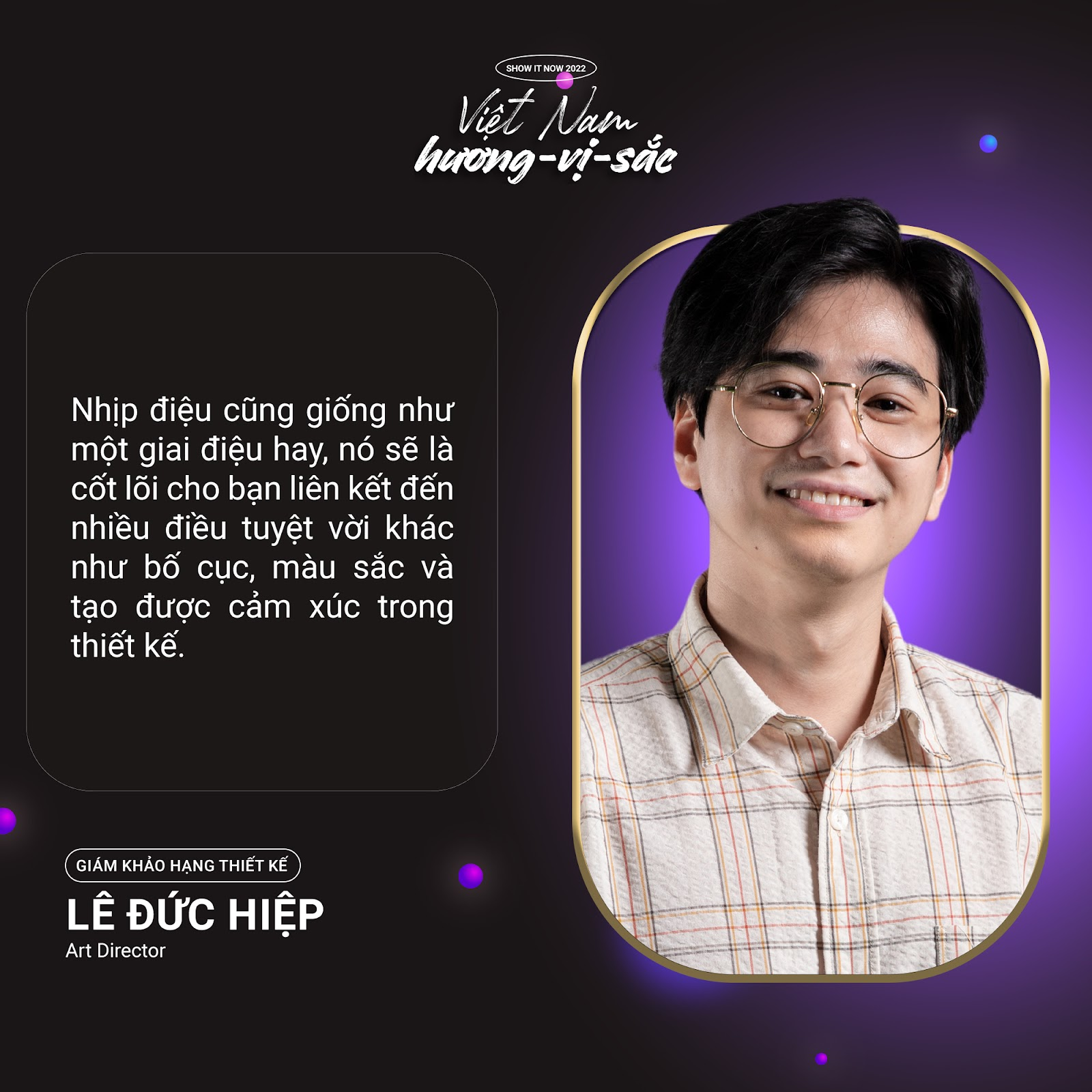 Creative Director Lê Đức Hiệp: “Tôi đang rất háo hức để được xem các Gen Z thể hiện ra sao về chủ đề cuộc thi “Việt Nam: Hương – Vị – Sắc”. Hãy kể những điều chân thực nhất về cuộc sống của bạn, quê hương, con người, bạn bè, trường lớp, tôi rất muốn được lắng nghe, chiêm ngưỡng và trải nghiệm vẻ đẹp của dải đất hình chữ S này thông qua chính lăng kính của các bạn trẻ.”