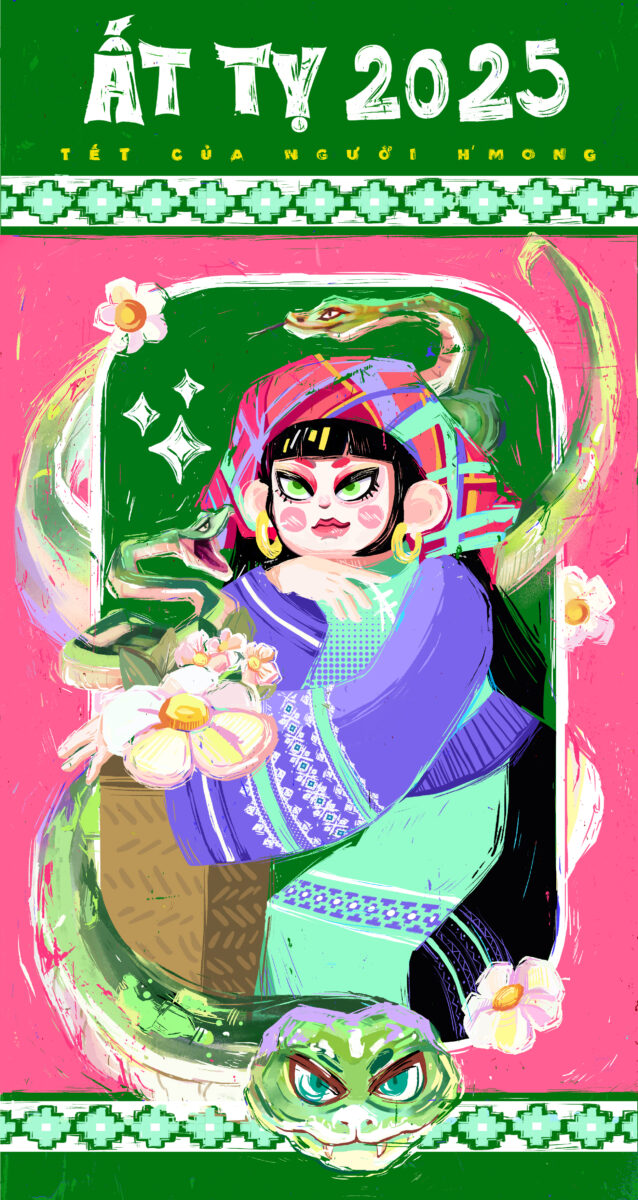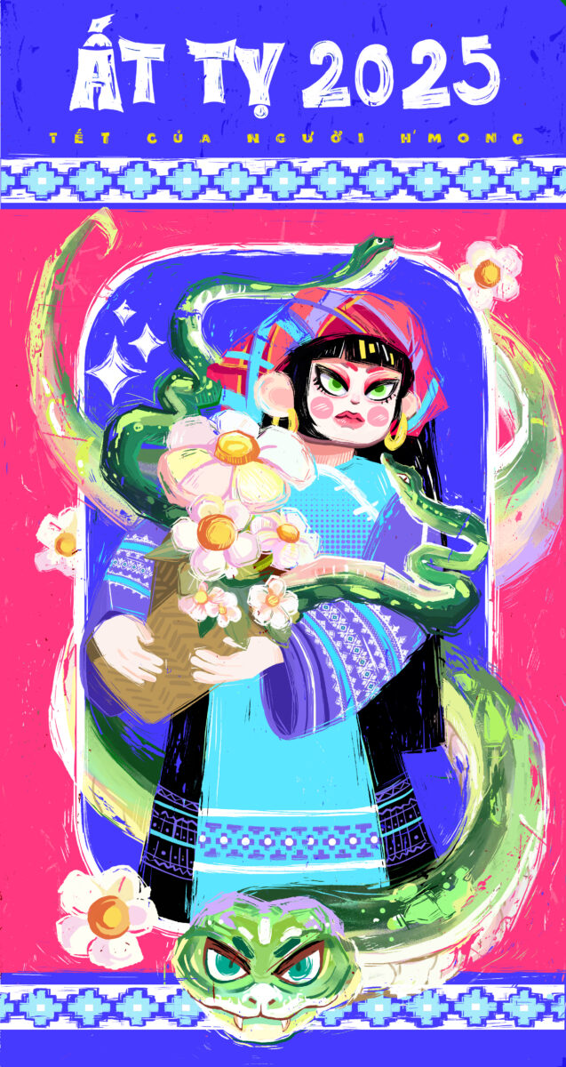 Trong thiết kế, biểu tượng con rắn (Ất Tỵ 2025) được cách điệu mềm mại, uốn lượn quanh nhân vật, vừa mang tính linh vật của năm mới, vừa đóng vai trò như một đường dẫn thị giác giúp kết nối bố cục. Họa tiết thổ cẩm xuất hiện ở viền và chi tiết trang trí, tạo điểm nhấn tinh tế và là sợi dây liên kết giữa quá khứ – hiện tại.