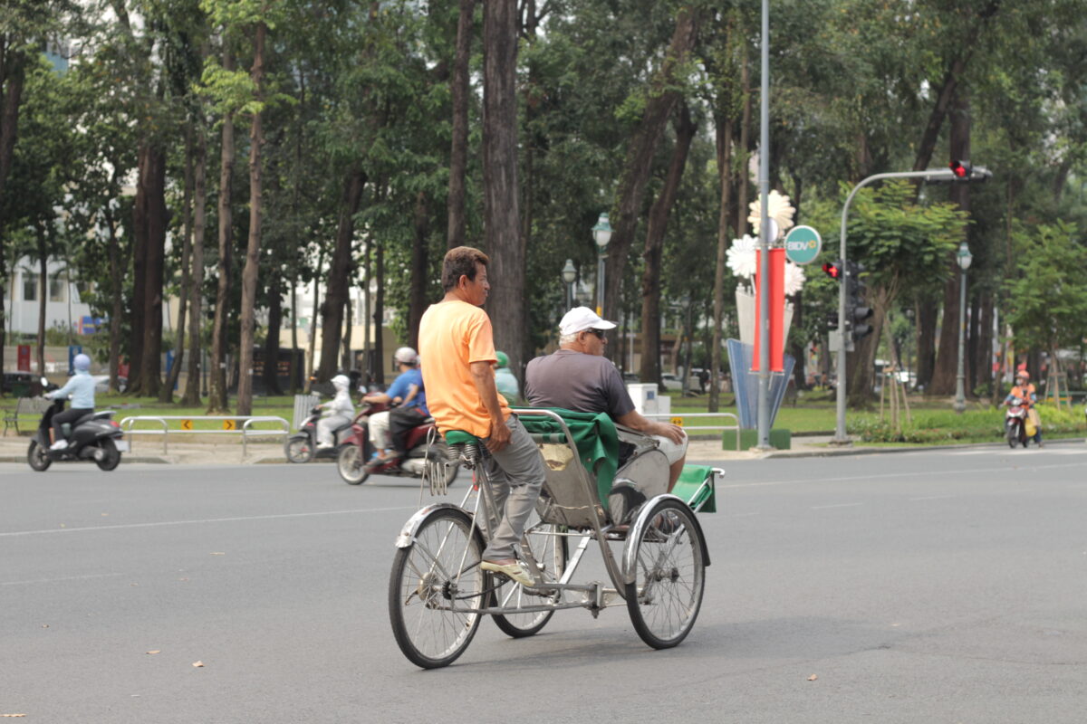 Tác phẩm 4: “Bánh xe ký ức” – Được chụp tại Dinh Độc Lập, chiếc xích lô chậm rãi lăn bánh, chở theo những câu chuyện cũ. Mỗi vòng quay như một nhịp thời gian, đưa ta trở về với phố phường ngày xưa.