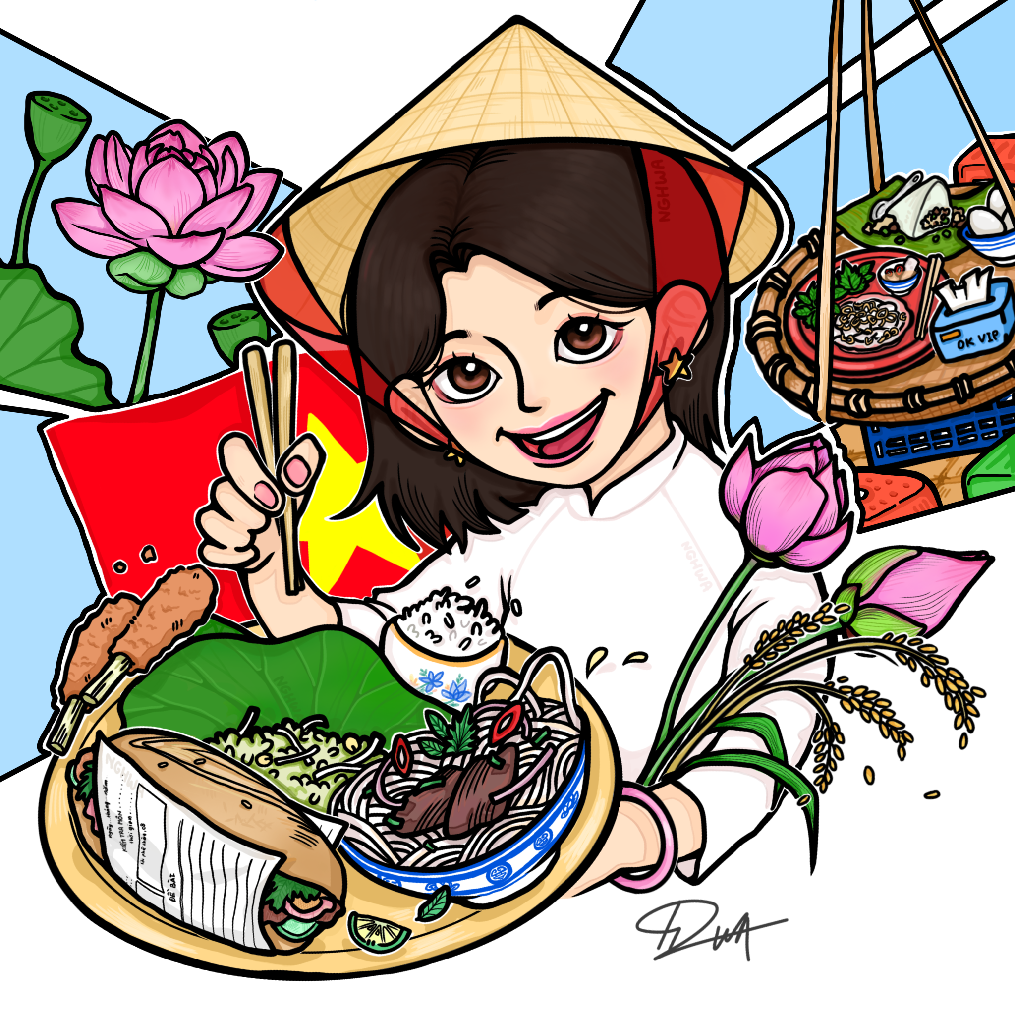 Mình tên là Hoa. Giống như tên, cuộc sống mình luôn tươi, xinh đẹp và thơ mộng. Mình nhìn cuộc đời bằng một tâm hồn mà ở nơi đó, cuộc đời được khắc hoạ lại bằng những mảng màu xanh đỏ, những nét vẽ uốn lượn… Và trong tâm hồn đó, mình còn là một hạt giống nhỏ trong khu vườn đất Việt. Việt Nam với vô vàn nét văn hóa đặc sắc, thoả mãn cái mong ước của một họa nô nhỏ trong mình về một thế giới muôn màu muôn vẻ. Vậy nên mình muốn hòa quyện hai phần linh hồn đó lại, mình muốn cho mọi người thấy cái đẹp của Việt Nam qua những nét vẽ có phần thô kệch của mình. Dù không được hoàn mĩ, không được văn thơ trừu tượng, nhưng đó là tâm huyết của mình, là cái nhìn của mình về văn hóa Việt Nam.