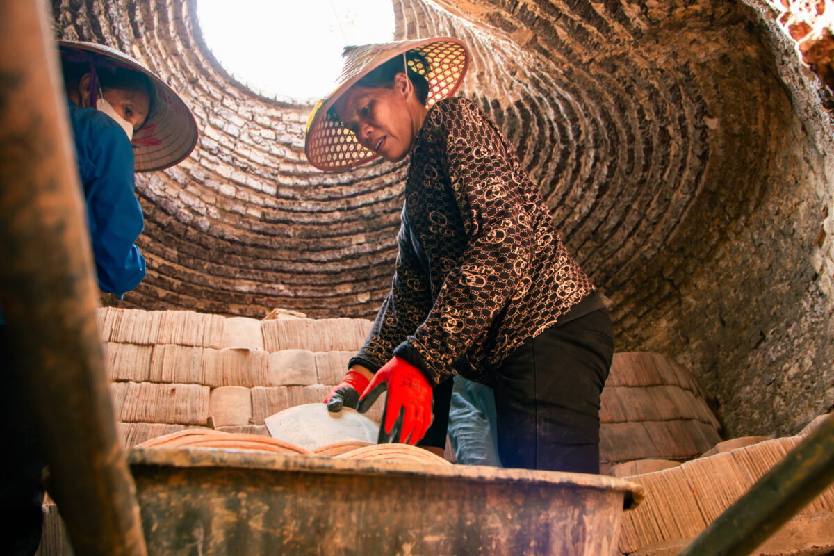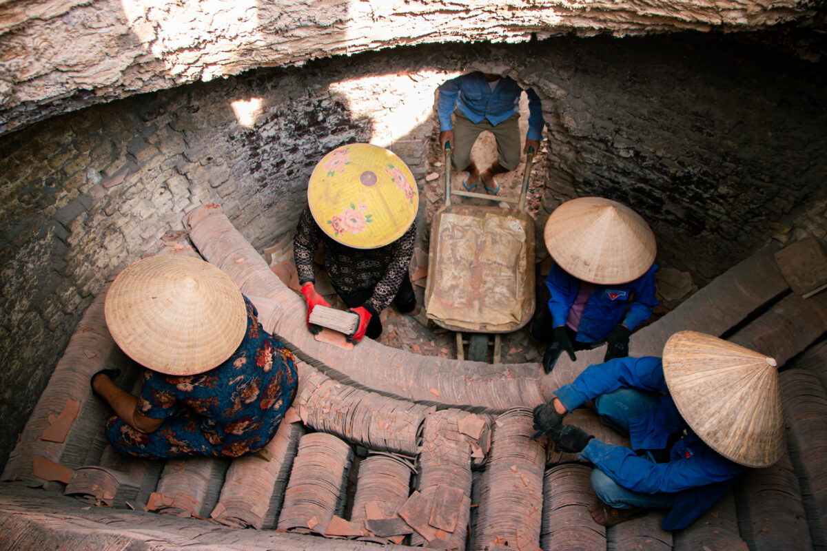 Người dân kiểm tra chất lượng ngói sau khi ra lò, chọn lọc những sản phẩm đạt chuẩn. Thời điểm này, mọi người mang ngói vừa nung ra ngoài. Mỗi lò nung thường chứa tới 60.000 viên ngói. Để có được thành phẩm, phải nung liên tục hơn 10 ngày đêm, họ thay phiên nhau canh lửa để giữ cho ngọn lửa cháy đều. Sau đó, ngói được để nguội trong lò khoảng 5 ngày trước khi lấy ra phân loại và xếp thành từng hàng. Trong lò nung ngói âm dương, hơi nóng hầm hập tỏa ra từ những lớp gạch khiến không gian luôn oi bức, ngột ngạt. Người thợ vẫn kiên nhẫn ngồi phân loại từng viên ngói, tay thoăn thoắt chuyền ra ngoài. Ai nấy vẫn đội chiếc nón lá quen thuộc, hình ảnh gắn liền với người lao động Việt Nam, vừa che nắng vừa tạo nên nét đẹp văn hóa truyền thống.