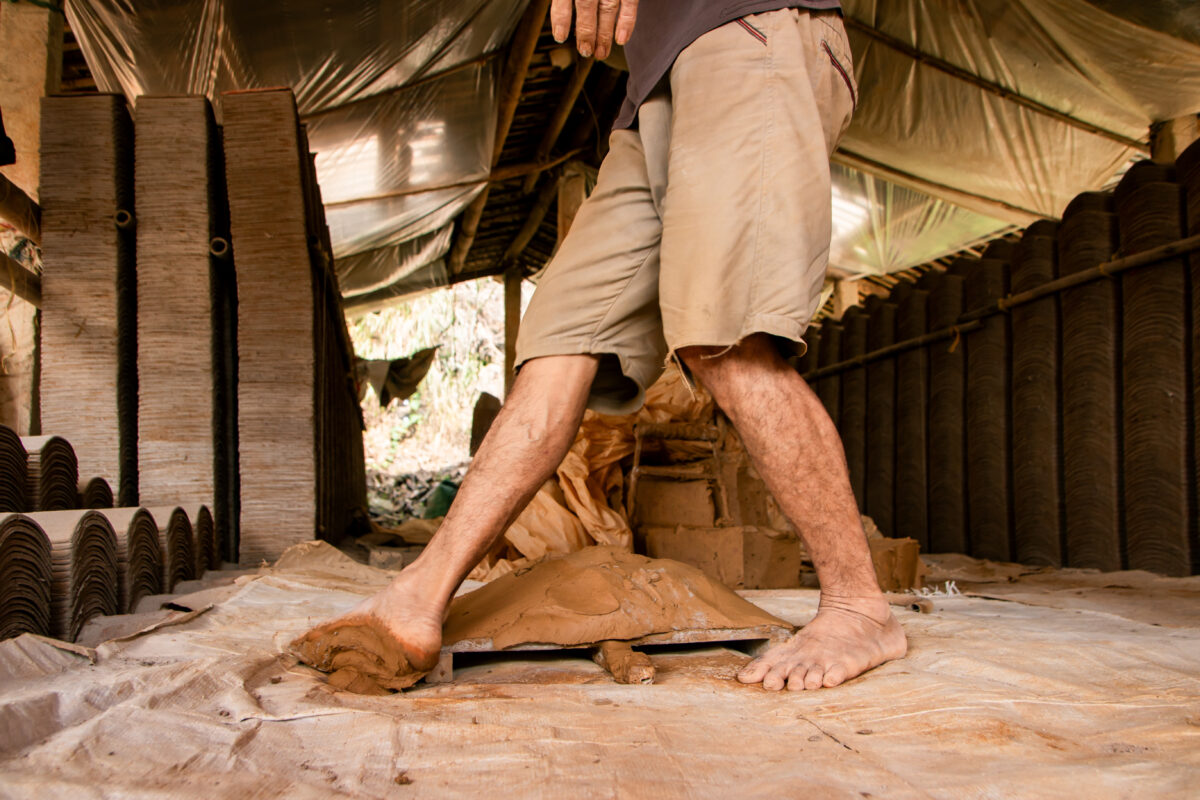 Quy trình sản xuất bắt đầu từ chọn đất sau đó làm nhuyễn đất, ủ đất, lọc tạp chất, cho đất vào khuôn thành viên ngói, nung ngói trong lò mới ra thành phẩm. Ở công đoạn này, người thợ dùng chân giẫm kỹ đến khi trộn đều và dẻo để tạo đất thành một viên hình hộp chữ nhật. Động tác dồn lực bằng bàn chân giúp đất bám chắc, trải đều, loại bỏ bọt khí và tạo độ kết dính trước khi được nén phẳng thành từng tấm ngói. Công đoạn này vừa đòi hỏi sức mạnh, vừa cần sự khéo léo để đất được phân bổ đều, tạo nền cho những viên ngói âm dương sau khi nung lên có độ bền chắc.