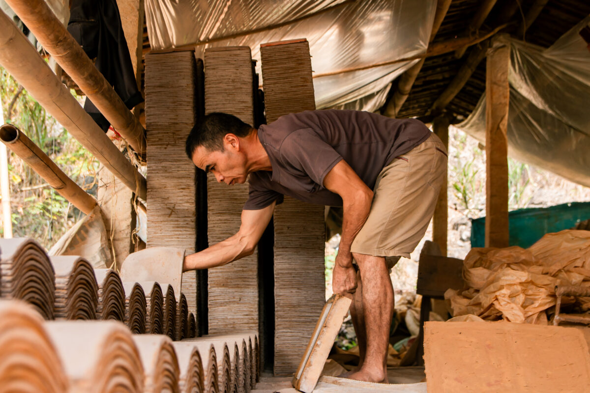 Sau khi đất đã được giẫm nhuyễn và đạt độ dẻo vừa ý, người thợ dùng dây cung để cắt phần đất thừa. Mỗi động tác đều đòi hỏi sự khéo léo và tỉ mỉ, từ việc cắt đất thành từng khối vừa đủ, đến việc nén chặt trong khuôn sao cho viên ngói có độ phẳng và dày đồng đều. Những viên ngói còn ướt, gọi là ngói mộc, được nhẹ nhàng lấy ra, xếp gọn thành từng lớp ngay ngắn trên các giàn gỗ hoặc sân phơi. Riêng thời gian phơi cũng phải mất từ 30-50 ngày, ngói mới đủ khô để đem nung trong lò. Với dân làng nơi đây, công việc không ngừng nghỉ, ngay cả ngày cuối tuần họ vẫn miệt mài bên lò, giữ cho làng nghề truyền thống không mai một.