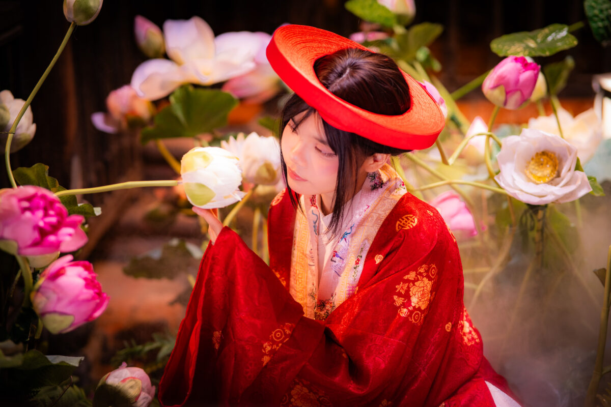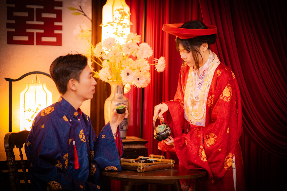 2. Tình Yêu và Sự Thanh Cao (Grace and Romance): Các bức ảnh không chỉ thể hiện sự uy nghiêm mà còn khắc họa vẻ đẹp duyên dáng, lãng mạn của cuộc sống thường nhật: Khoảnh khắc nhẹ nhàng bên hoa sen, thưởng trà, tôn vinh sự thanh tao, thi vị của tâm hồn người phụ nữ. Hình ảnh đôi nam nữ trong trang phục truyền thống, đứng dưới mưa phùn (hoặc làn nước nhẹ), tạo nên khung cảnh lãng mạn, gửi gắm thông điệp về sự gắn kết, hòa hợp của đôi lứa Việt.
