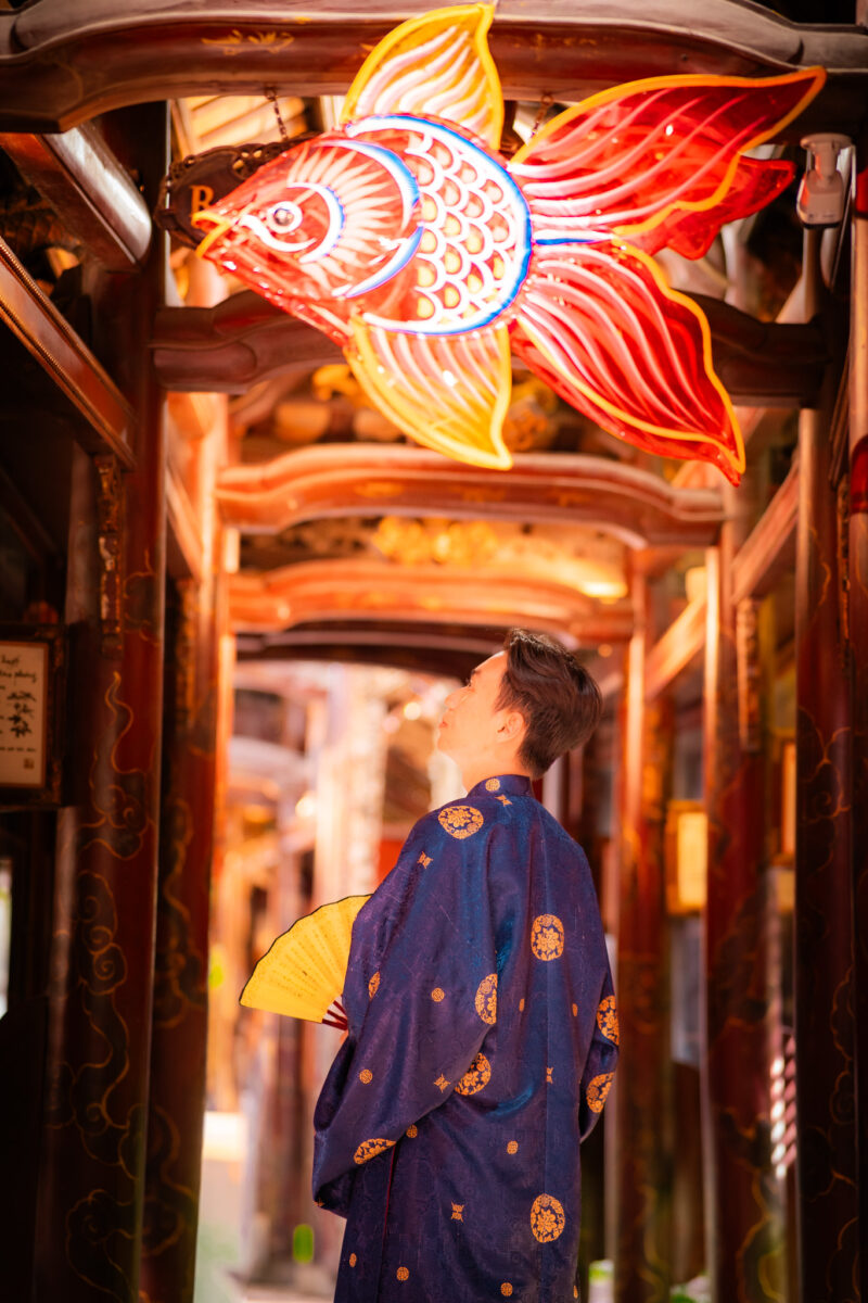 1. Khám phá Di sản (Cultural Heritage): Áo Nhật Bình nổi bật với màu đỏ son rực rỡ, biểu tượng cho may mắn, quyền quý và hạnh phúc. Thiết kế đặc trưng là hoa văn hình chữ nhật trên cổ áo và họa tiết thêu kim tuyến tinh xảo, thường là hình ảnh chim phượng, thể hiện địa vị và sự cao sang của người mặc. Bộ ảnh được thực hiện trong không gian kiến trúc cổ kính (như nhà Rường hoặc các công trình mang phong cách Triều Nguyễn), giúp đặt trang phục vào bối cảnh lịch sử chân thực nhất.