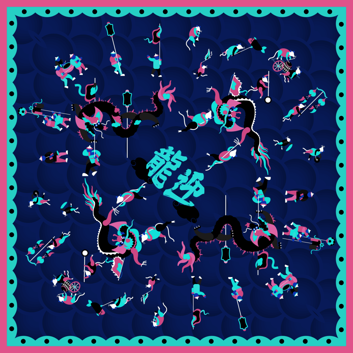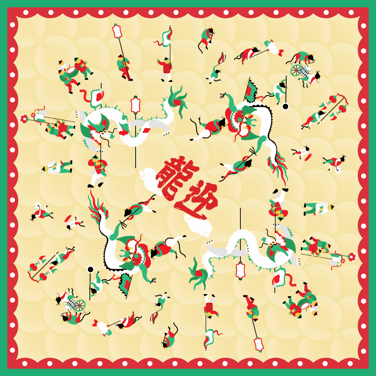 Bandana “Long Nghênh” (Đón Rồng) là sản phẩm thiết kế lấy cảm hứng từ hai bức tranh Đông Hồ: “Rước Rồng” và “Chuột Rước Rồng”, nhằm tái hiện tinh thần văn hóa dân gian Việt Nam trong dịp Tết cổ truyền. Cả hai bức tranh đều hiện dòng chữ “龍迎” (Long Nghênh), biểu tượng cho sự chào đón may mắn và thịnh vượng. Ý tưởng của mình bắt đầu từ việc kết hợp hình ảnh từ hai bức tranh này, nơi các nhân vật vui nhộn – từ rồng uy nghiêm, chuột tinh nghịch đến người dân rước kiệu – chạy vòng tròn xung quanh chữ “龍迎” trung tâm, tạo nên một vòng lặp hài hòa tượng trưng cho sự luân hồi và sum vầy. Việc kết hợp này mang ý nghĩa sâu sắc, hòa quyện giữa tinh thần nghiêm trang, ca ngợi cuộc sống bình yên và cầu mong thành đạt, thịnh vượng từ bức “Rước Rồng” với yếu tố tiếu lâm dân gian hài hước, thể hiện cuộc sống đủ đầy, hạnh phúc và vui tươi từ “Chuột Rước Rồng”, từ đó nhấn mạnh thông điệp về sự hài hòa giữa con người và thiên nhiên, giữa truyền thống và hiện đại, chào đón một năm mới tràn đầy may mắn và tiếng cười. Sản phẩm được phát triển thành hai phiên bản: Truyền Thống với tông màu ấm áp, cổ điển gợi nhớ nét vẽ thủ công dân gian; và Hiện Đại với sắc màu rực rỡ, phá cách để phù hợp với lối sống đương đại.