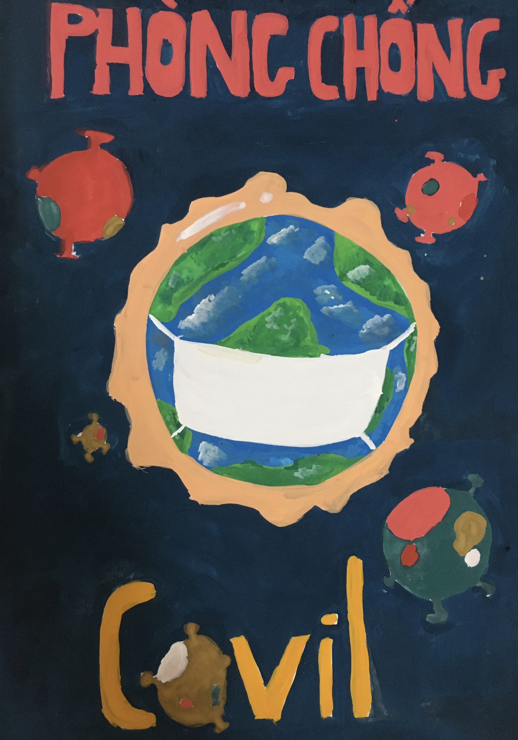 Đây là hình ảnh Địa cầu xung quanh là những con virus đang cố xâm nhập, nếu chúng ta có cách phòng chống và nghe những chỉ dẫn của Chủ tịch nước bằng cách đeo khẩu trang khi ra ngoài thì có thể ngăn chặn nguy cơ lây lan dịch bệnh.