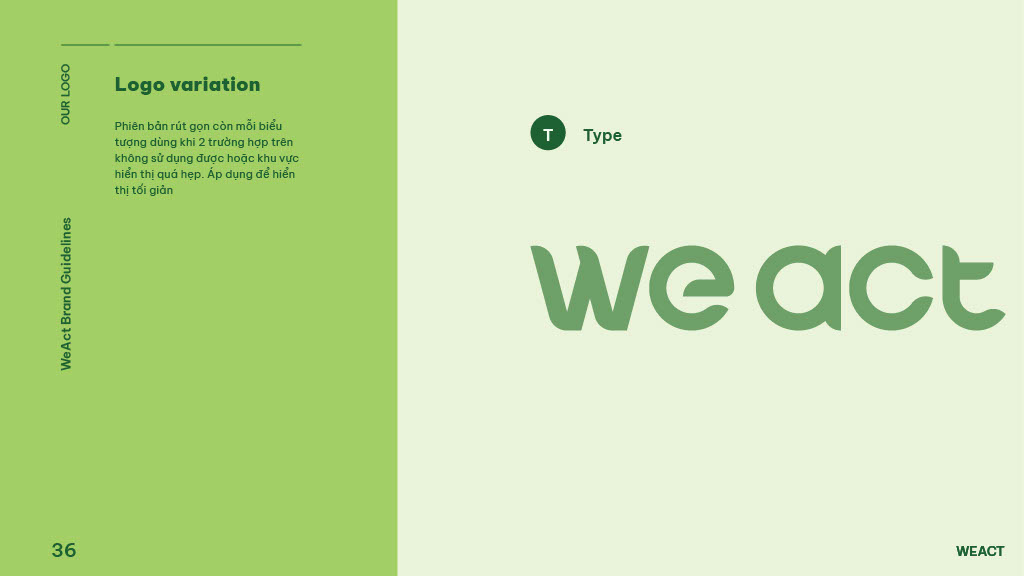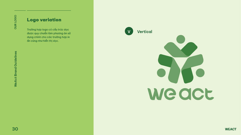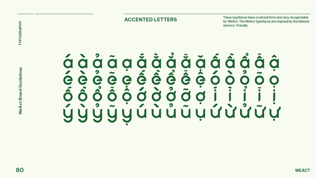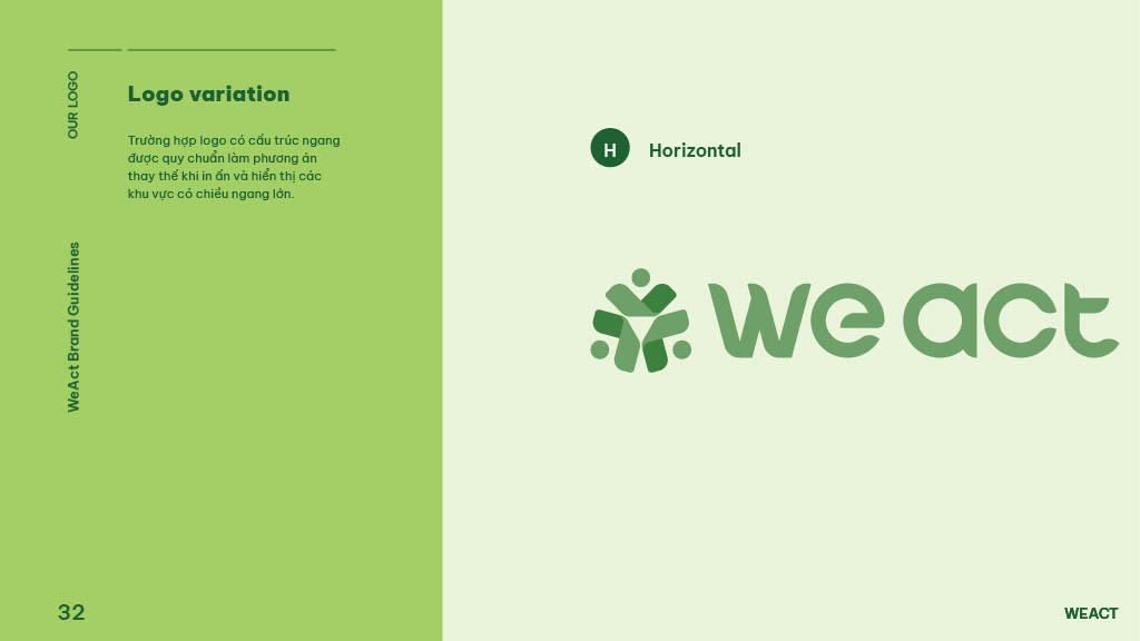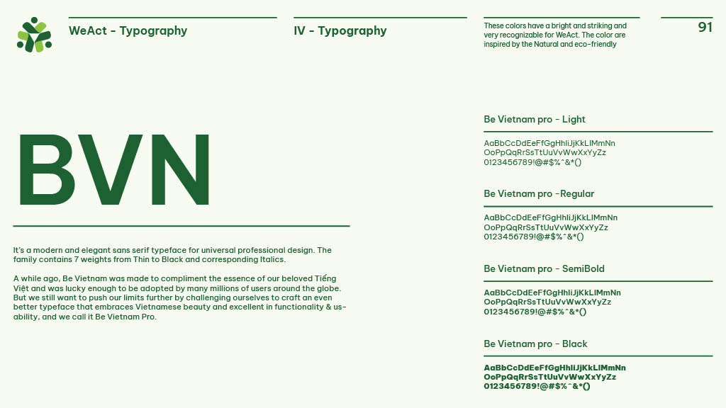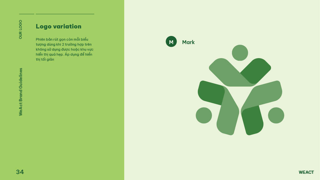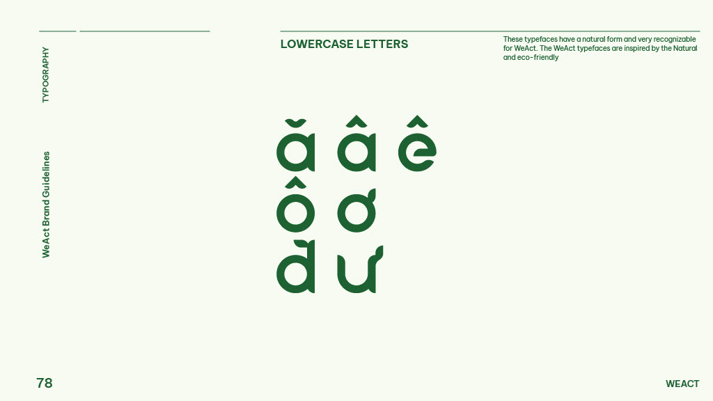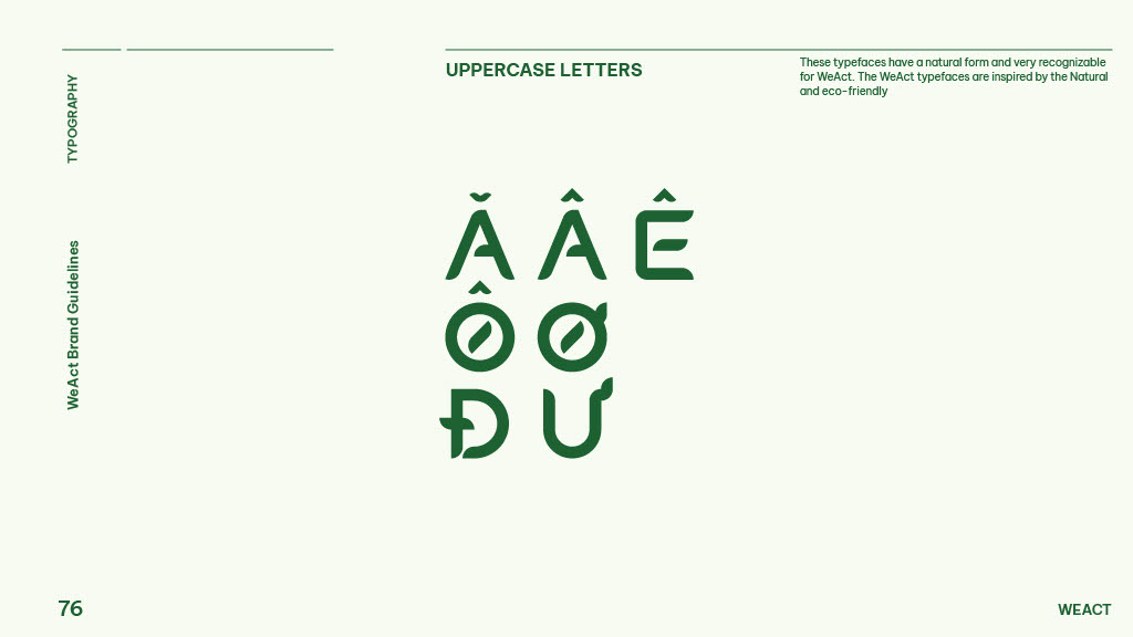 Ý tưởng của mình là một bộ branding kế thừa tinh thần của WeEarth, là WeAct hay ý là hành động của chúng ta đó là một tổ chức kết nối cũng như xây dựng cộng đồng nâng cao ý thức về hành động của mình có ảnh hưởng đến môi trường. Mình mong muốn bộ brand này có tính cách thân thiện, hiện đại, tối giản nhưng không quá nghiêm túc để tạo sự thân thiện của một tổ chức về vấn đề môi trường hơn. Logo của mình là cách điệu từ hình ba người đang dang tay lên xếp thành hình tròn của trái đất như câu ca dao tục ngữ “một cây làm chẳng lên non, ba cây chụm lại lên hòn núi cao” như một cách bản địa hoá bộ brand này. Bên cạnh đó giá trị mình muốn đem lại là tính cộng đồng, thân thiện, và vì môi trường nên “key visual” và bộ font của mình được thiết kế riêng lấy cảm hứng từ thiên nhiên nhằm phục vụ ý đồ của mình cũng như để nó phù hợp với tinh thần mình muốn thể hiện qua đề tài năm nay. Bên cạnh đó mình có sản xuất một “key visual” riêng để nhằm thừa kế hoá tinh thần của WeEarth để lại bằng cách tạo hình chú bướm như một “optional choice” cũng như do hạn hẹp về thời gian và sức lực nên mình chưa thể thật sự bộc lộ hết toàn bộ những gì mình có thể làm nên mong mọi ng bỏ qua thiếu sót.