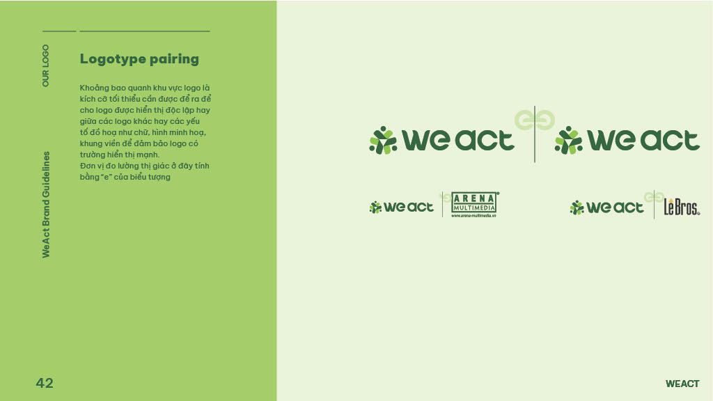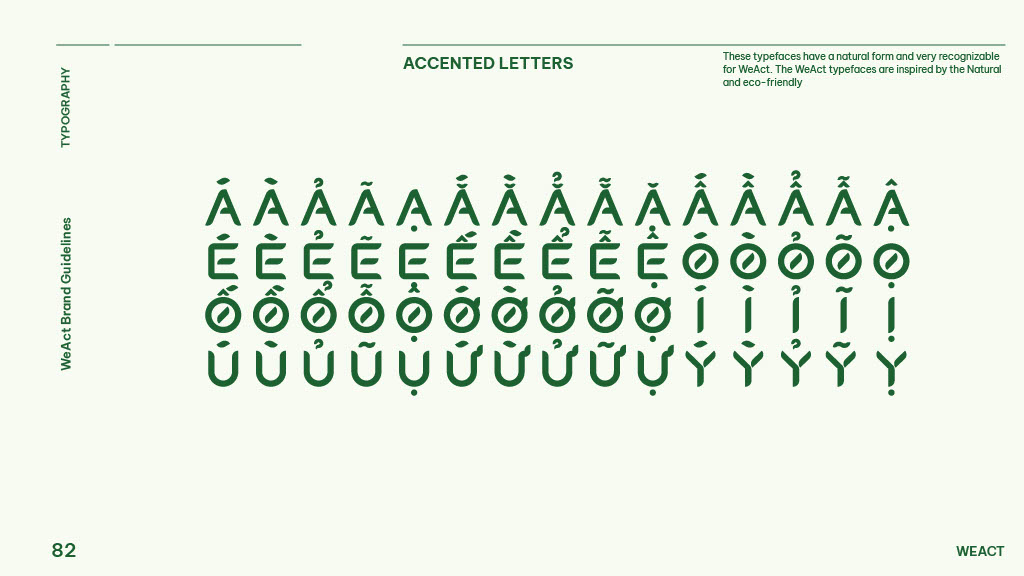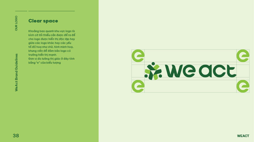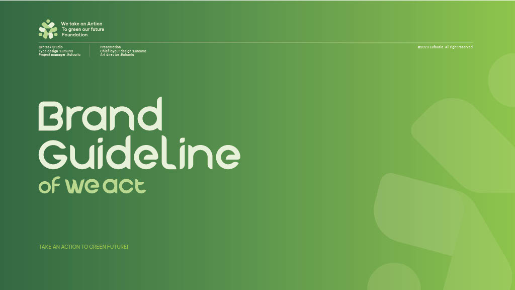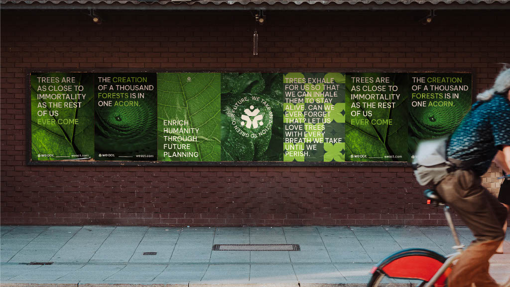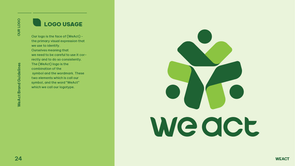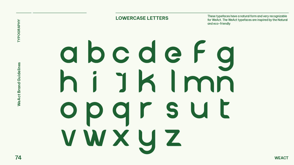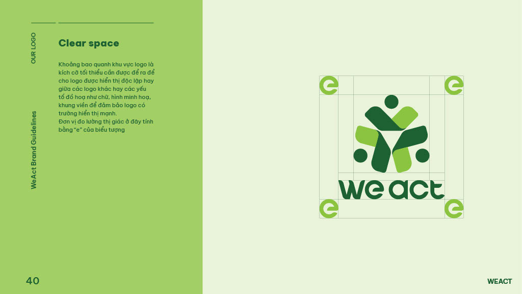 Ý tưởng của mình là một bộ branding kế thừa tinh thần của WeEarth, là WeAct hay ý là hành động của chúng ta đó là một tổ chức kết nối cũng như xây dựng cộng đồng nâng cao ý thức về hành động của mình có ảnh hưởng đến môi trường. Mình mong muốn bộ brand này có tính cách thân thiện, hiện đại, tối giản nhưng không quá nghiêm túc để tạo sự thân thiện của một tổ chức về vấn đề môi trường hơn. Logo của mình là cách điệu từ hình ba người đang dang tay lên xếp thành hình tròn của trái đất như câu ca dao tục ngữ “một cây làm chẳng lên non, ba cây chụm lại lên hòn núi cao” như một cách bản địa hoá bộ brand này. Bên cạnh đó giá trị mình muốn đem lại là tính cộng đồng, thân thiện, và vì môi trường nên “key visual” và bộ font của mình được thiết kế riêng lấy cảm hứng từ thiên nhiên nhằm phục vụ ý đồ của mình cũng như để nó phù hợp với tinh thần mình muốn thể hiện qua đề tài năm nay. Bên cạnh đó mình có sản xuất một “key visual” riêng để nhằm thừa kế hoá tinh thần của WeEarth để lại bằng cách tạo hình chú bướm như một “optional choice” cũng như do hạn hẹp về thời gian và sức lực nên mình chưa thể thật sự bộc lộ hết toàn bộ những gì mình có thể làm nên mong mọi ng bỏ qua thiếu sót.