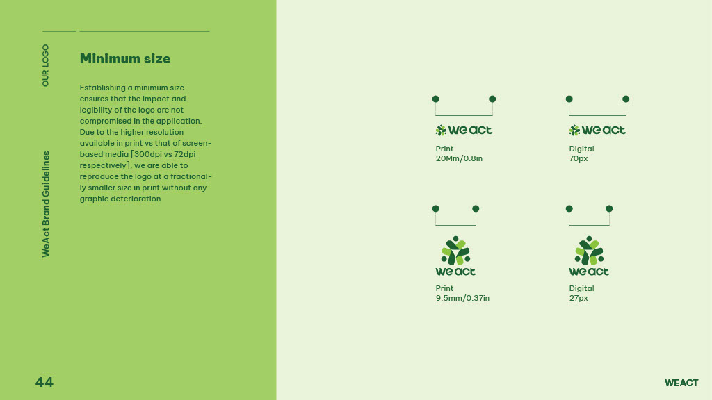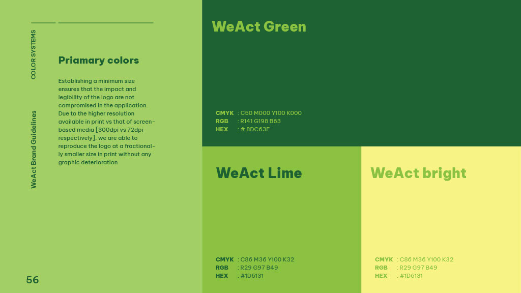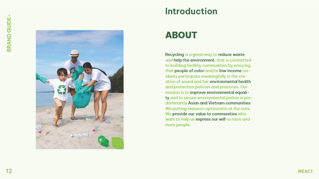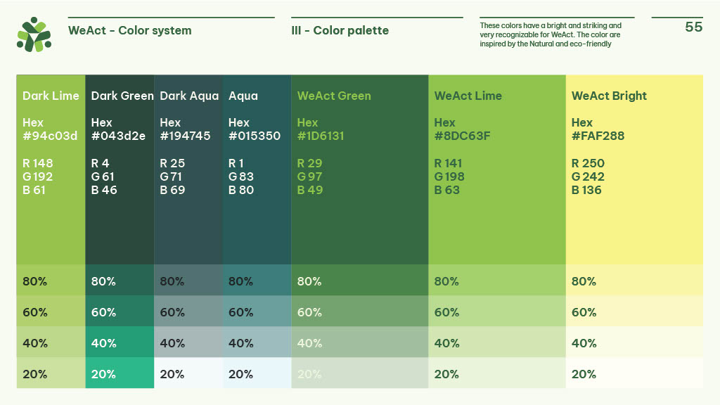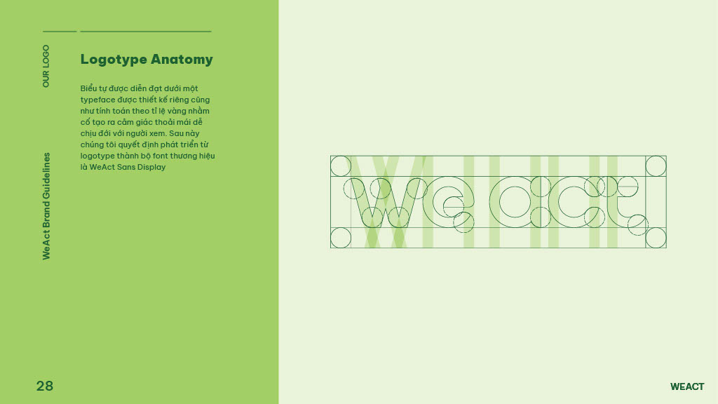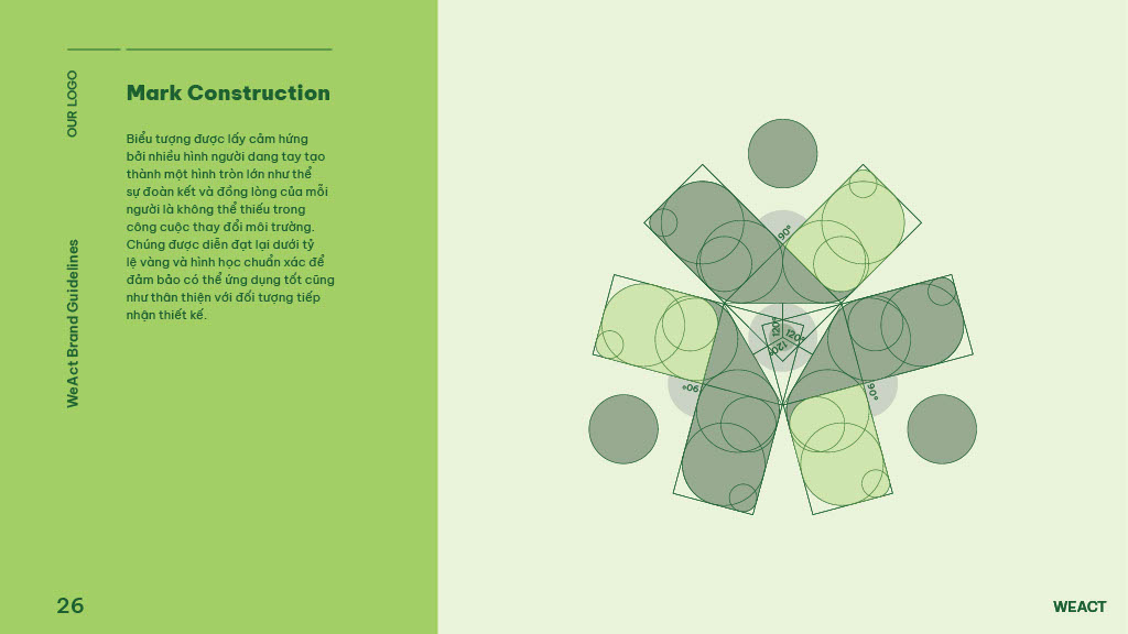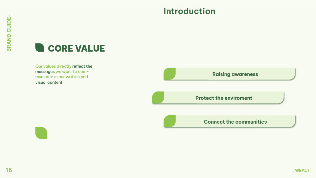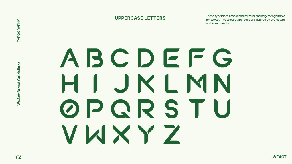 Ý tưởng của mình là một bộ branding kế thừa tinh thần của WeEarth, là WeAct hay ý là hành động của chúng ta đó là một tổ chức kết nối cũng như xây dựng cộng đồng nâng cao ý thức về hành động của mình có ảnh hưởng đến môi trường. Mình mong muốn bộ brand này có tính cách thân thiện, hiện đại, tối giản nhưng không quá nghiêm túc để tạo sự thân thiện của một tổ chức về vấn đề môi trường hơn. Logo của mình là cách điệu từ hình ba người đang dang tay lên xếp thành hình tròn của trái đất như câu ca dao tục ngữ “một cây làm chẳng lên non, ba cây chụm lại lên hòn núi cao” như một cách bản địa hoá bộ brand này. Bên cạnh đó giá trị mình muốn đem lại là tính cộng đồng, thân thiện, và vì môi trường nên “key visual” và bộ font của mình được thiết kế riêng lấy cảm hứng từ thiên nhiên nhằm phục vụ ý đồ của mình cũng như để nó phù hợp với tinh thần mình muốn thể hiện qua đề tài năm nay. Bên cạnh đó mình có sản xuất một “key visual” riêng để nhằm thừa kế hoá tinh thần của WeEarth để lại bằng cách tạo hình chú bướm như một “optional choice” cũng như do hạn hẹp về thời gian và sức lực nên mình chưa thể thật sự bộc lộ hết toàn bộ những gì mình có thể làm nên mong mọi ng bỏ qua thiếu sót.