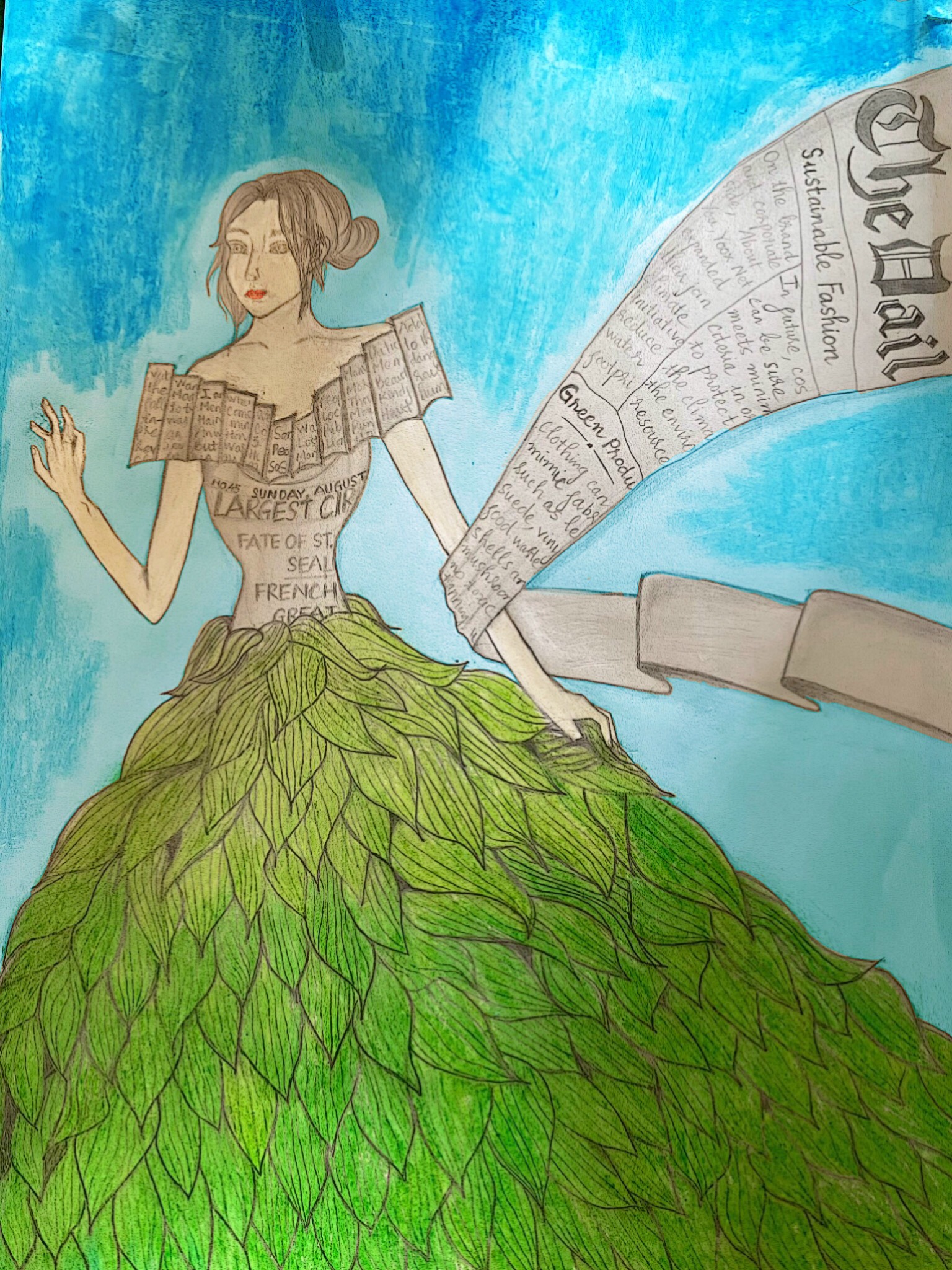 “Sustainable Fashion” là một ý tưởng về thời trang bền vững, thân thiện và gần gũi với môi trường. Tác phẩm là sự kết hợp mềm mại giữa báo được bao quanh ở phần thân của chiếc đầm và những chiếc lá cây tạo thành phần thân dưới. Hiện nay thì cũng có rất nhiều thương hiệu thời trang lớn vươn tầm quốc tế mang chất liệu thiên nhiên vào những bộ sưu tập thời trang của họ để gửi gắm những thông điệp ý nghĩa về thời trang bảo vệ môi trường đến đại đa số người dân trên toàn thế giới. Những điều đó đã gây tác động mạnh mẽ đến em nên em quyết định làm nên bức tranh này. Thật lòng mà nói thì tác phẩm này không phải là một bài dự thi đặc sắc và hoàn hảo nhưng em thật lòng muốn truyền cảm hứng đến cho mọi người về việc sử dụng thời trang bền vững, góp phần vào một môi trường xanh.