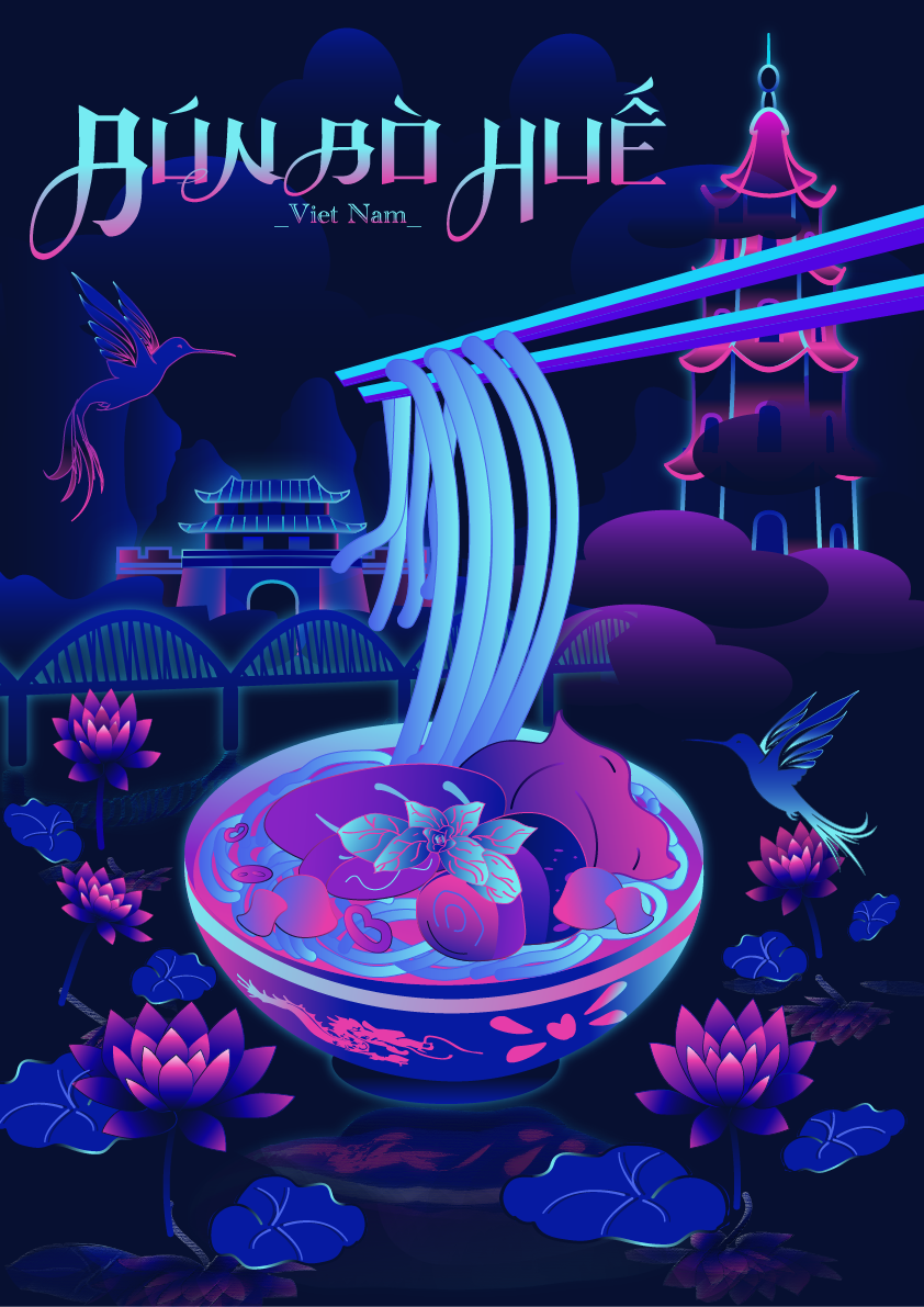 Vì dạo này em thèm bún bò Huế nhưng bị đè deadline và thời tiết không cho phép nên em làm ra tấm poster này với niềm tin và một tâm hồn ăn uống to lớn. Khi nghĩ về Huế em có tìm hiểu và chọn một vài danh lam thắng cảnh, văn hoá đặc trưng của Huế để đem vào bài. Về tô bún thì em làm một tô bún full topping đầy đủ. Màu em muốn nó trẻ trung một síu độc lạ một chút nên em chọn màu có độ tương phản cao và nền tối màu để nổi bật những chi tiết có trong poster của em.