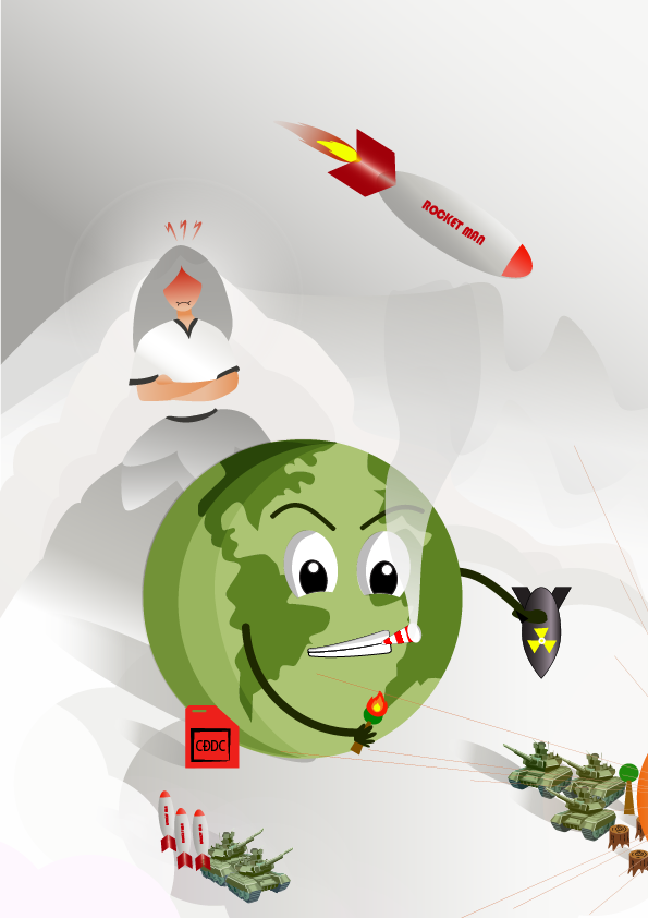 Trái Đất đang kêu cứu! Sự ô nhiễm đang dần phá hủy đi “Hòn bi xanh” của chúng ta và thế hệ mai sau. Bên cạnh những hoạt động xấu của con người làm ảnh hưởng hủy hoại tài nguyên thiên nhiên, thì vẫn còn một hoạt động đáng báo động cấp thiết hơn cả, đó là chiến tranh. Ukraina và Nga đối chiến, những lần thử tên lửa hạt nhân của Triều Tiên, hay sự bành trướng của anh bạn hàng xóm Trung Quốc trên biển Đông,… là những tin tức sốt dẻo nhất mà ta có thể thấy nó xuất hiện ở mọi mặt báo cho đến những lời buôn chuyện của các chú hàng xóm. Thế nó ảnh hưởng như thế nào đến môi trường? Chiến tranh ảnh hưởng trực tiếp đến con người, động thực vật. Trong cuộc chiến tranh hóa học mà Mỹ gây ra với quy mô lớn ở Việt Nam trong giai đoạn từ năm 1969 – 1971, quân đội Mỹ đã sử dụng chất dioxin, chất độc màu da cam, chất diệt cỏ và chất phát quang để rải xuống 24,67% lãnh thổ nước ta. Thời gian phân hủy chất này lên đến 20 năm, đất đai bị nhiễm độc và làm đảo lộn hệ sinh thái, giày xéo bao thế hệ cha ông nước ta qua hàng thập kỷ từ hệ lụy mà nó mang lại. Tàn phá rừng, cái hố bom, các vụ cháy rừng sản sinh khí carbon,… Hậu quả của chiến tranh mang lại thật tàn khốc, qua đó tác phẩm của mình muốn thể hiện một phần cuộc chiến và sự nổi giận của Mẹ Thiên Nhiên đối với những điều đó. Hướng đến một Thế Giới Hòa bình và môi trường được đảm bảo, nâng cao đời sống của người. “Trái đất này là của chúng mình, quả bóng xanh bay giữa bầu trời xanh…” – Định Hải.