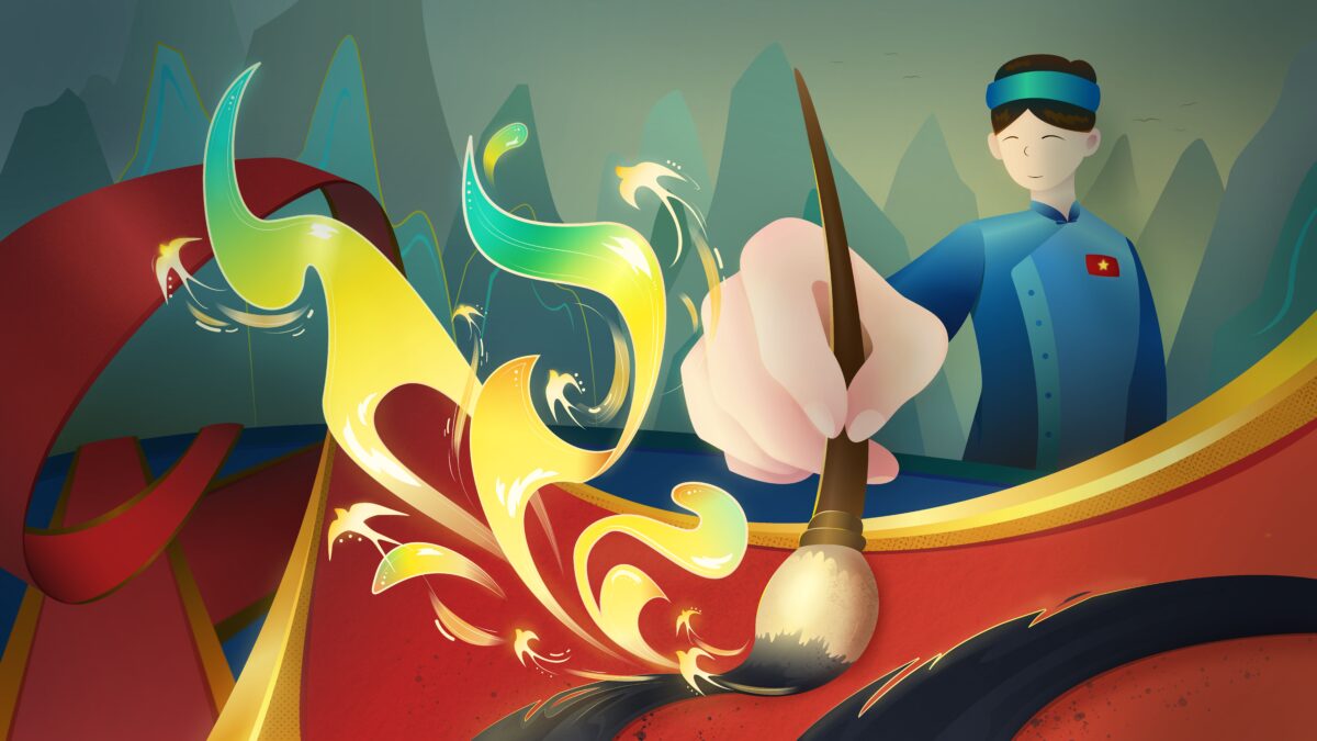 Nhắc đến tết ta luôn nghĩ đến nhiều hình ảnh quen thuộc như nấu bánh chưng bánh tét, đi chơi lễ hội, xem pháo hoa, khoác lên mình những màu áo mới,…đặc biệt nhất là tục xin chữ – cho chữ. Bắt nguồn từ những người hiếu học và trân trọng từng nét chữ đẹp nên ngày xuân xin chữ cũng giống như cầu mong tài lộc may mắn về. Là một phong tục lâu đời thể hiện sự tri thức, trọng chữ nên cho chữ – xin chữ cũng thể hiện mong muốn được con chữ để lấy may mắn, hạnh phúc. Người cho chữ là ông đồ túc nho với những đường cọ uyển chuyển và nét mực đen nhạt ngẫu nhiên, mỗi nét cọ như một lần vẫy đũa phép cho người xin chữ nên hình ảnh những tia vàng lấp lánh và chim én tung bay thể hiện sự tịnh tiến, tương lai sáng lạng.