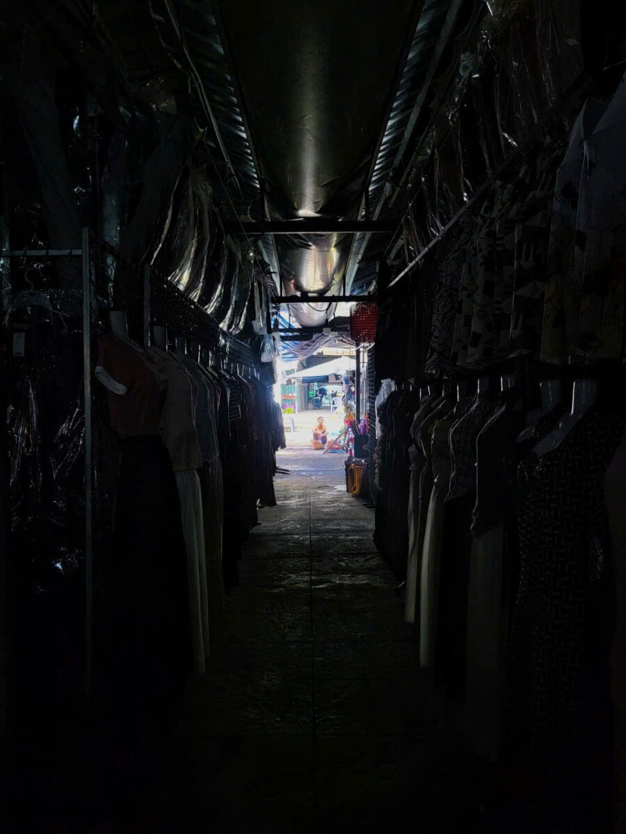 - Tác phẩm 1: Chụp cụ bà đang ngồi nghỉ mệt ở bên kia đường, giữa những dãy quần áo. Không gian bên trong tối tăm, chật chội, tương phản với khoảng mở, thoáng bên ngoài nơi có bà cụ. Điều này tạo cảm nhận về khoảnh khắc cô đơn nhưng bình yên, như “ngồi giữa hai thế giới”.