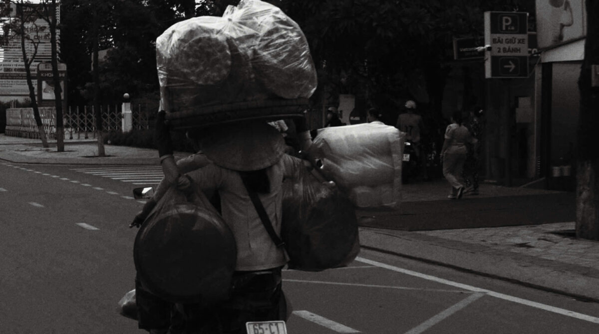 Tác phẩm 3: Người phụ nữ trong ảnh có lẽ đã bắt đầu ngày mới từ tinh mơ, đi khắp phố phường để buôn bán, nhặt nhạnh hay chở hàng thuê. Cả thế giới của chị nằm trên chiếc xe – những túi đồ, bao tải, và cả ước mơ nhỏ về một cuộc sống đủ đầy hơn. Tông đen trắng khiến câu chuyện càng lặng, nhưng lại đầy sức nặng và nhân văn.