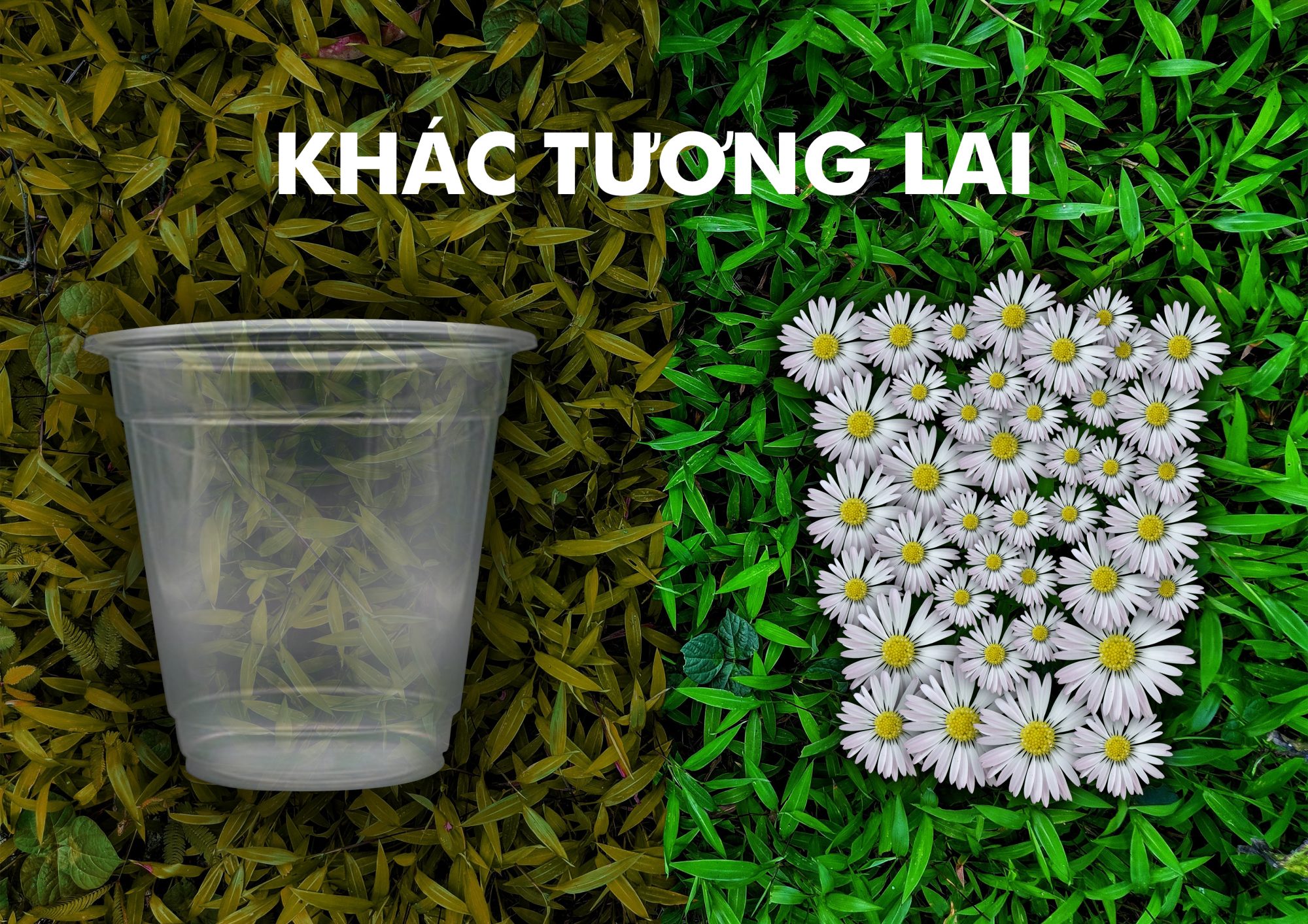 Với 2 câu : Cùng Số phận – khác tương lai, có 2 chiếc cốc khác chất liệu đều bị vứt xuống đất, nhưng sau một khoảng thời gian nhất định, chiếc cốc giấy đã phân hủy và mọc hoa xung quanh, trong khi đó chiếc cốc nhựa vẫn còn nguyên, xung quanh cỏ héo úa.