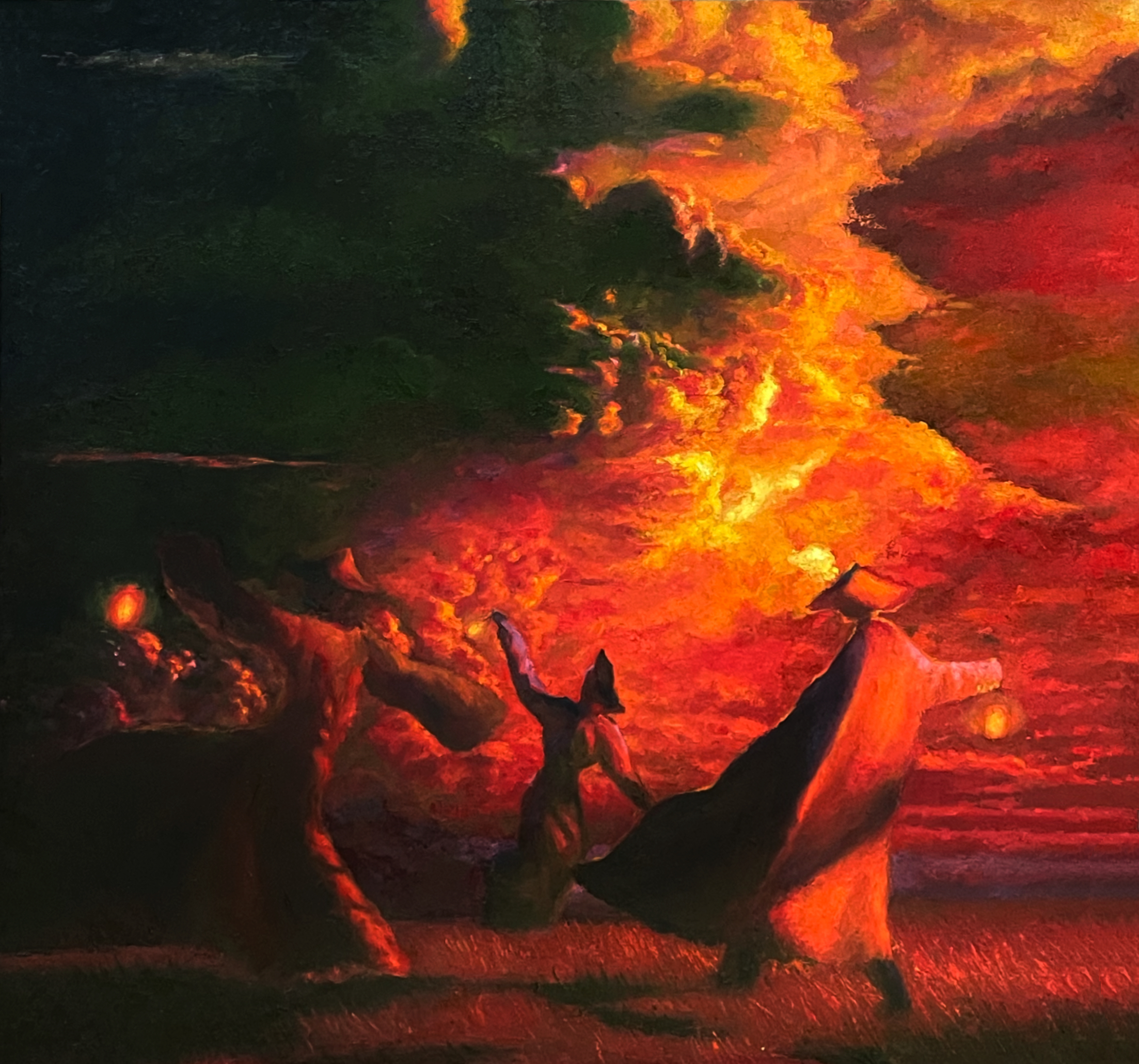 Tác phẩm mang tông màu đỏ gắt là chủ đích của tác giả muốn khuếch đại sự nguy hiểm, trắc trở mà trận vần vũ ấy sắp đem tới. Trong đêm tối mưa bão bập bùng ấy những con người nhỏ bé vẫn nón lá áo tơi, cầm những chiếc đèn bão để chống chọi với cơn bão lớn. Nó thể hiện cho sự quật cường của ý chí con người chinh phục thiên nhiên khắc nghiệt.
