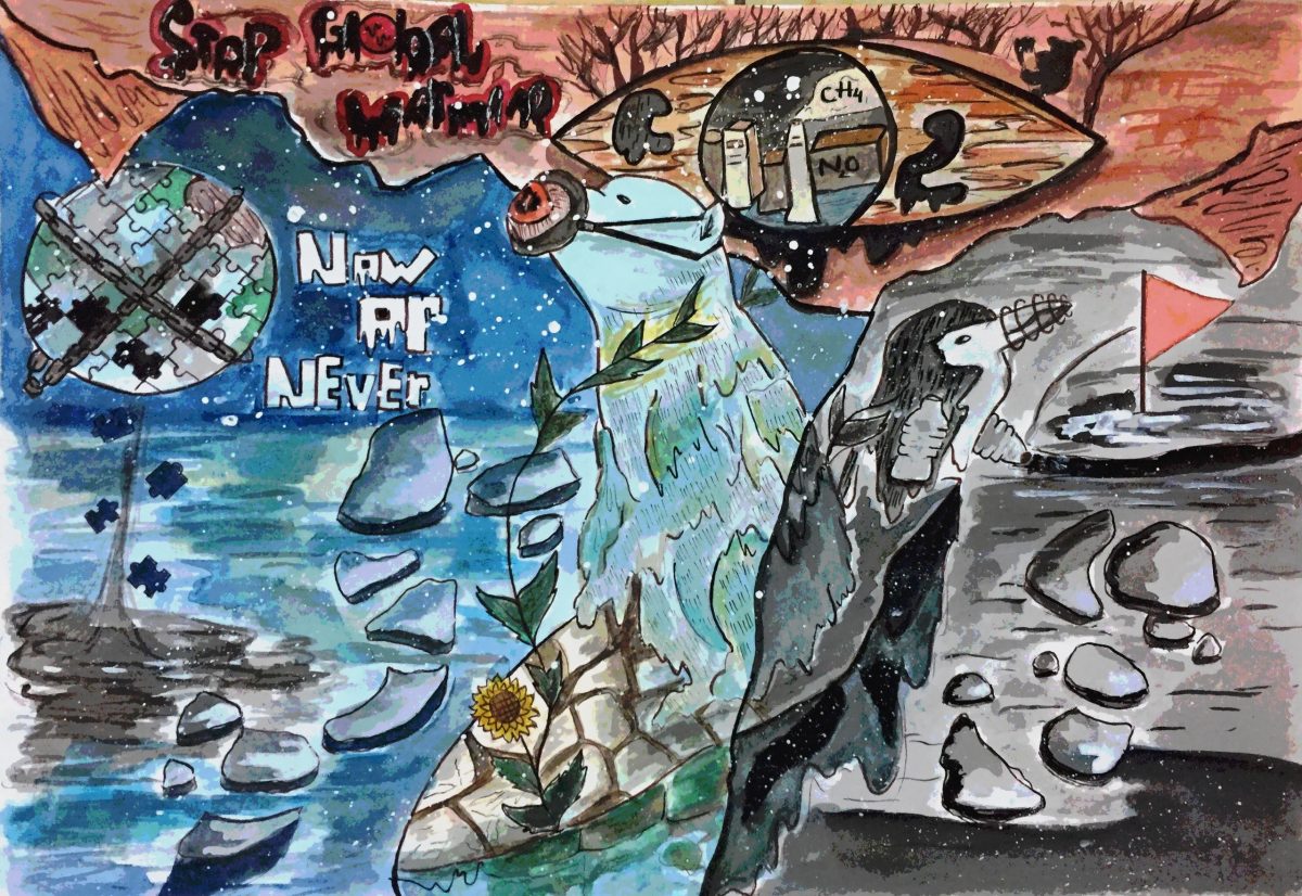 Tác phẩm của mình cũng đã lột tả phần nào của mặt tối ấy, bức tranh được xé thành ba mảnh tượng trưng cho sự vụn vỡ của hành tinh xanh này trở thành một màu u tối đến đau lòng nhưng con người dường như vẫn không muốn thấy những mặt tối ấy mà vẫn tiếp tục tổn thương đến thiên nhiên. Điều ấy cũng đã cướp đi biết bao nhiêu là sinh mạng vô tội ở ngoài kia, động vật đã và đang dần mất đi nơi sinh sống mà chúng vốn được tự do, nhiều loại động vật quý hiếm khác, cũng đã có một số loài tuyệt chủng vì mất đi nơi ở vì hiệu ứng nhà kính dẫn đến sự nóng lên toàn cầu. Cháy rừng, băng tan ,…và còn rất rất nhiều hậu quả do con người đã và đang làm cho chính bản thân họ. Nhưng vấn đề nào cũng có hai mặt của nó, bên cạnh số đông đang gián tiếp tàn phá hành tinh này, vẫn còn một số người đang cố gắng níu giữ sự sống cho Trái Đất bằng tất cả những gì họ có thể, nhưng chỉ tiếc thay số nhỏ người đó tiếng nói của họ chưa đủ vang vọng đến những người khác, họ vẫn còn gặp nhiều vấn đề mà họ chưa thể giải quyết trên con đường bảo vệ lá phổi xanh của chúng ta. Nên mình hy vọng qua cuộc thi này, mọi người có thể biết đến cuộc thi nhiều hơn, từ đó hãy cùng nhau lan tỏa thông điệp chung tay bảo vệ hành tinh này bằng những việc nhỏ nhặt như hạn chế được lượng rác thải xuống biển, sử dụng bình nước cá nhân, sử dụng túi vải thay bao nilon, 1 người có thể không làm được gì nhiều, nhưng cứ 100 rồi lại 1000 người, con số ấy nếu cứ tăng thì một ngày nào đó lá phổi xanh sẽ được chữa lành và sẽ trở lại.