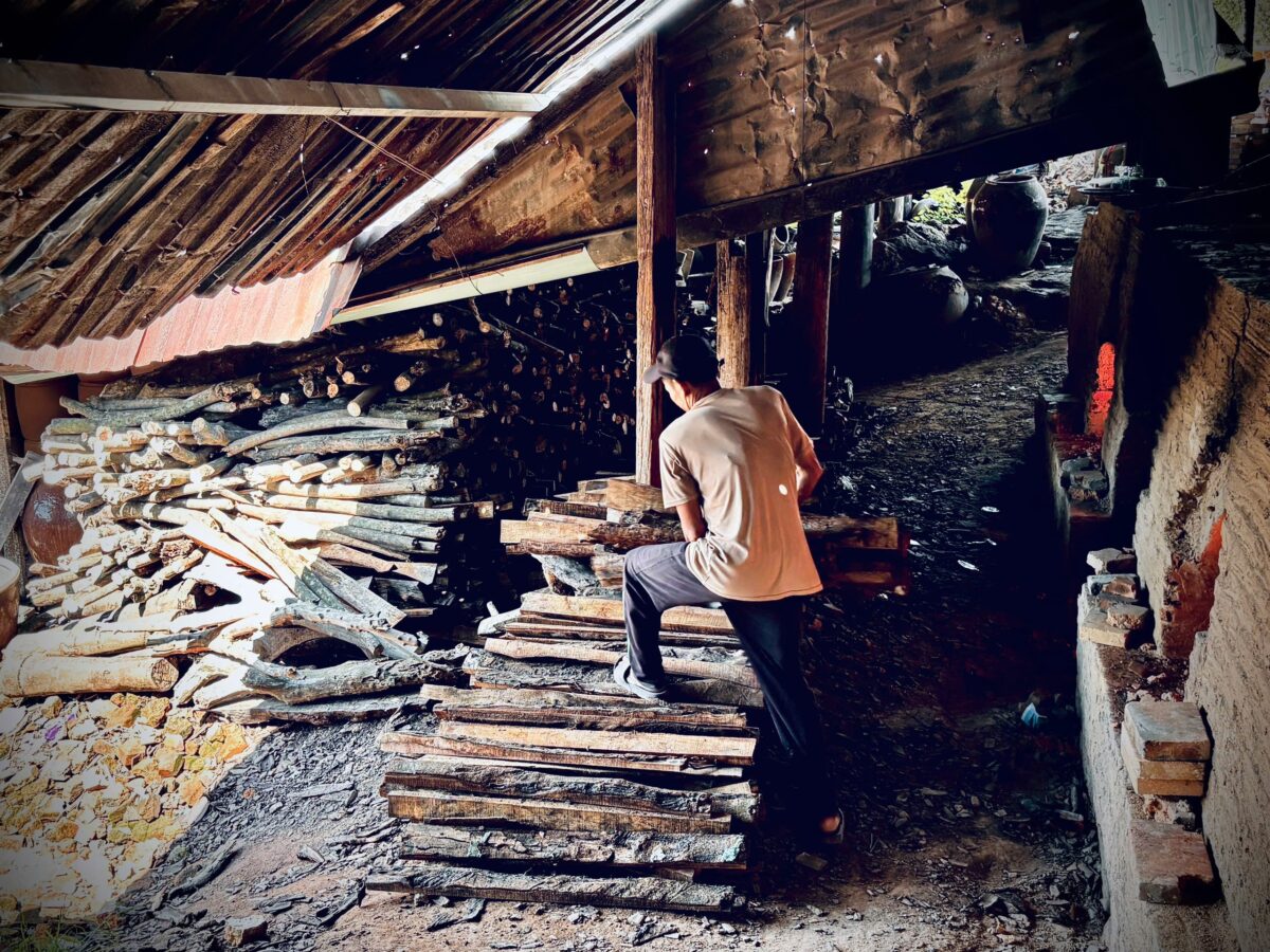Trong bóng tối của lò nung, người thợ miệt mài xếp từng thanh củi – hơi nóng và mùi gỗ cháy quyện thành nhịp thở của nghề. Ngọn lửa chưa cháy, nhưng đã nhen trong ánh mắt cần lao.