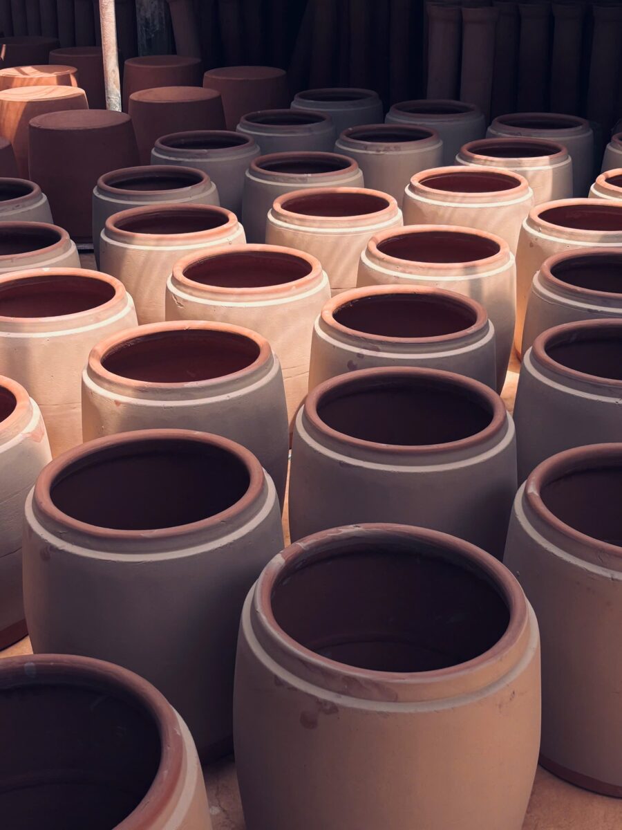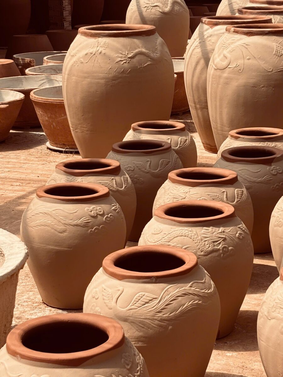 Những chiếc lu đất mộc xếp hàng ngay ngắn, chờ ánh lửa nung để hóa thành hình hài bền vững. Giữa nắng gắt, sắc đất thô mộc vẫn ánh lên niềm kiêu hãnh của nghề gốm lâu đời. Tĩnh lặng nhưng ẩn chứa hơi thở của sự sống đang dần thành hình.