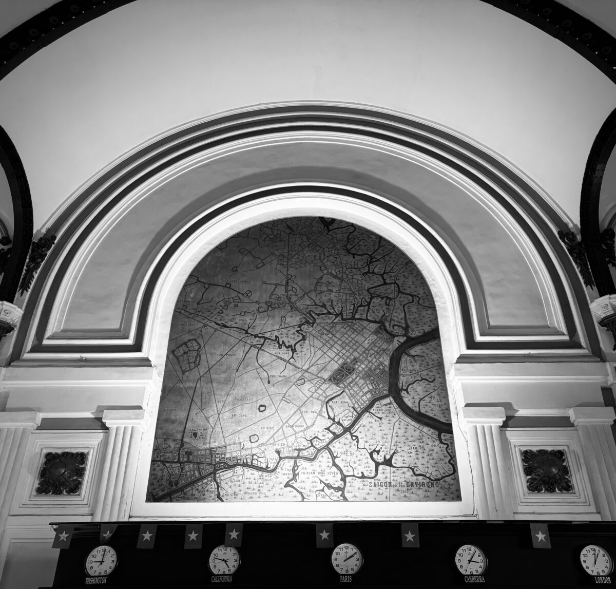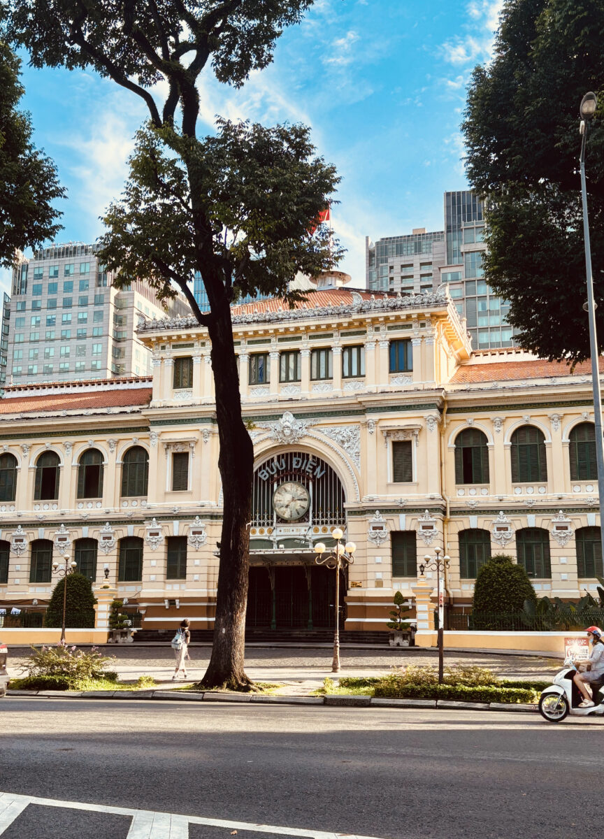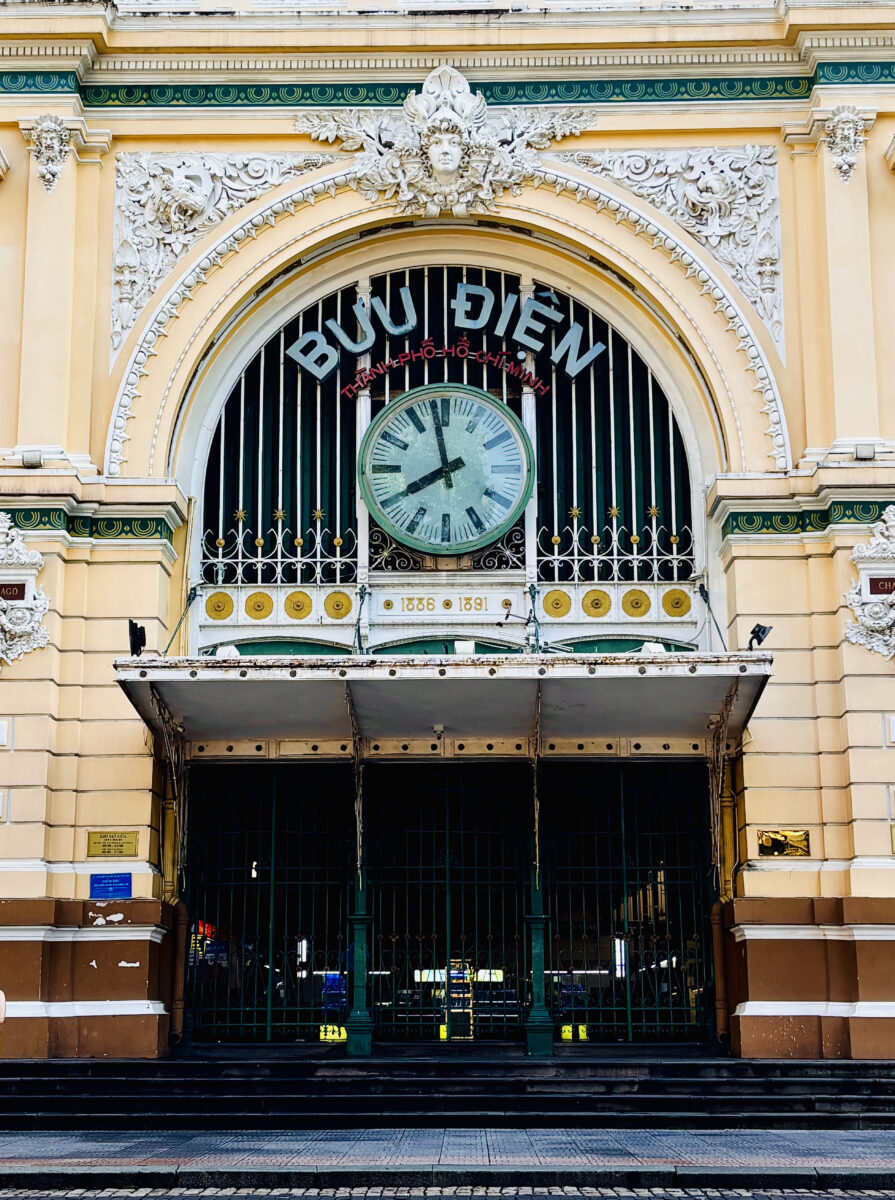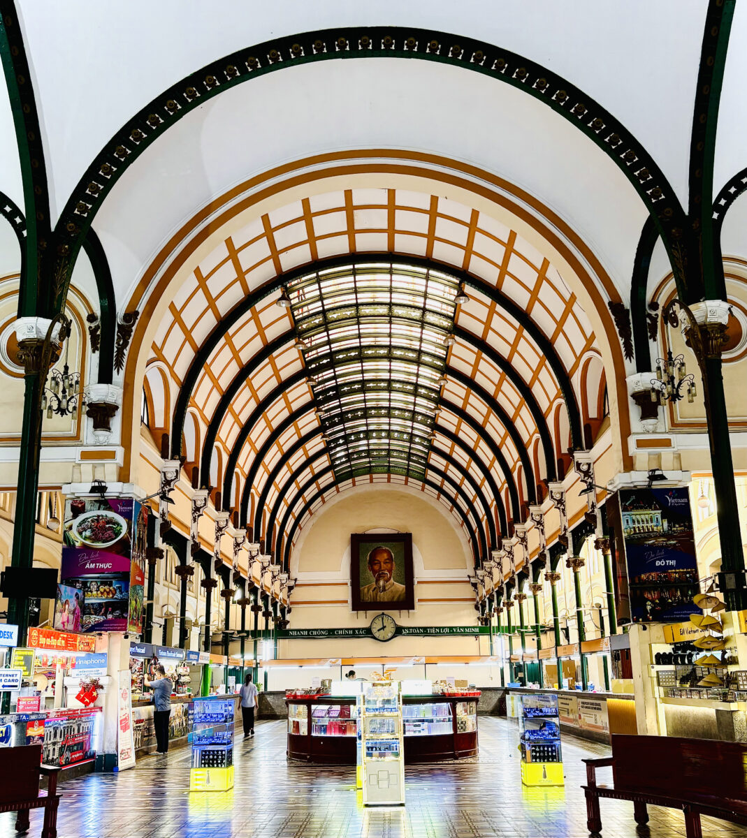 Những bức ảnh được chụp tại Bưu điện Trung tâm Thành phố Hồ Chí Minh, một trong những công trình kiến trúc tiêu biểu mang đậm dấu ấn Pháp thuộc. Bộ ảnh này đã ghi lại vẻ đẹp hòa quyện giữa cổ điển và hiện đại – từ mái vòm uốn cong, ô cửa sắt xanh đậm cho đến sàn gạch hoa tinh xảo. Bên trong, ánh sáng tự nhiên xuyên qua lớp kính cong, tạo nên không gian vừa trang nghiêm vừa ấm áp. Mỗi khung hình như một “tấm bưu thiếp sống”, gửi đi thông điệp về dấu ấn thời gian và vẻ đẹp trường tồn của Sài Gòn xưa.