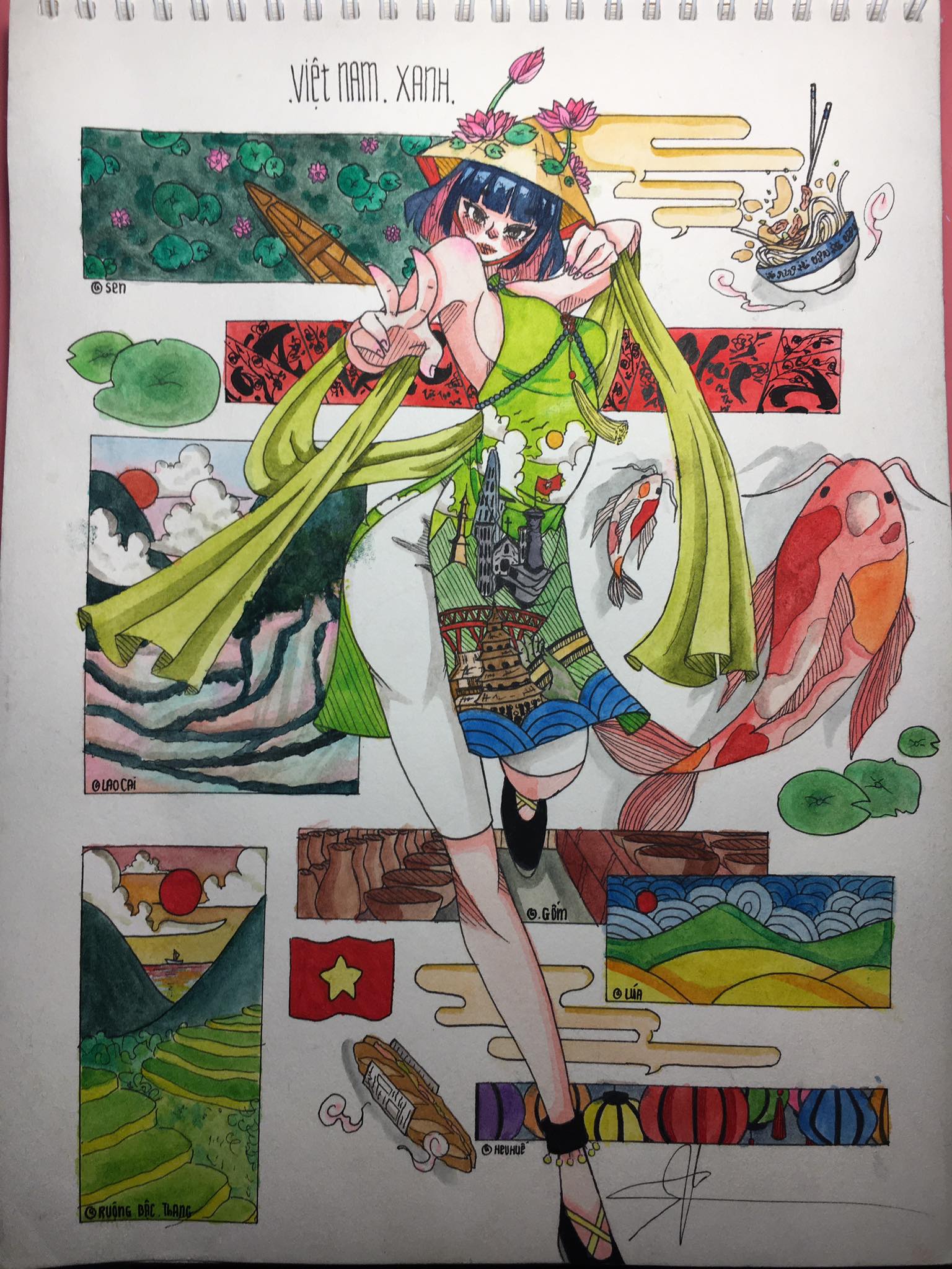 Một tác phẩm được lấy cảm hứng từ tất cả những địa danh, hay tất cả những ẩm thực hay truyền thống của Việt Nam. Cái nhìn của em về Việt Nam là một đất nước xanh thuần khiết, một đất nước hội tụ những cái đẹp của sự tinh hoa văn hóa. Nên bức tranh em mang đến mang rất nhiều ý nghĩa từ cả những chi tiết nhỏ. Một bức tranh chứa đựng cả Việt Nam, chứa đựng toàn bộ những gì mà em cảm nhận được, em thấy được từ Việt Nam-nơi em đang sống và là đất nước em yêu.
