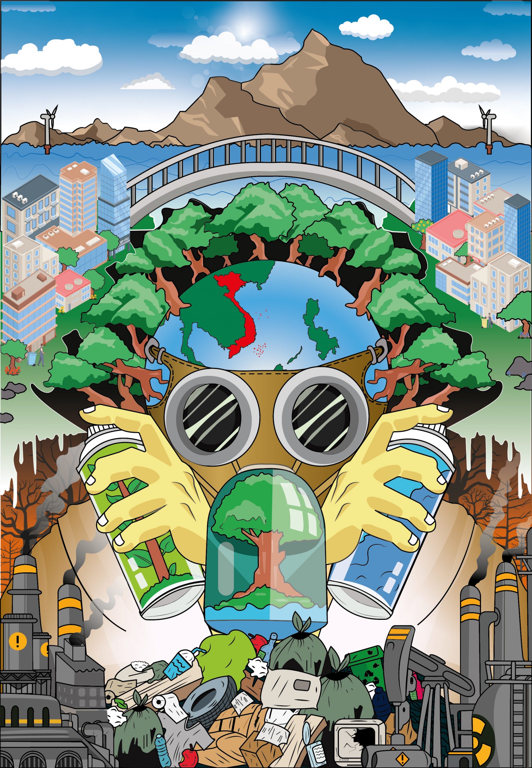 Tác phẩm của em có tên “Màu xanh của Trái Đất”, để nhắc lại cho mọi người nhớ rằng chúng ta đã từng có một Trái Đất trong xanh như thế nào. Hiện nay môi trường sống của con người và cả những loài sinh vật, thực vật sống dưới biển hay trên cạn đều đang bị đe dọa bởi ô nhiễm môi trường như môi trường đất, nước và không khí. Bức tranh của em lấy cảm hứng một phần từ đại dịch Covid và tình trạng ô nhiễm môi trường hiện nay. Em nghĩ môi trường bị ô nhiễm làm ảnh hưởng đến sức khỏe của con người, sinh vật, thực vật thì cũng giống như một dịch bệnh truyền nhiễm sẽ dần giết chết tất cả mọi thứ trên Trái Đất. Một con người đang ở thời điểm bị ô nhiễm nghiêm trọng đang cố gắng tô lại một môi trường trong xanh ban đầu. Em mong muốn bức tranh của mình sẽ làm mọi người nhìn nhận được việc này thật sự quan trọng thế nào. Và hãy cùng nhau giữ gìn môi trường như chúng ta đã từng chống lại đại dịch Covid-19 một cách rất đoàn kết. Có một câu nói mọi người hay truyền tai nhau là “phòng bệnh hơn chữa bệnh”. Vì thế chúng ta hãy hành động bảo vệ môi trường ngay từ bây giờ như trồng cây xanh, tiết kiệm điện, hạn chế dùng nilon, hạn chế hóa chất thải vào môi trường,… hoặc đơn giản nhất ai cũng có thể làm là hãy “BỎ RÁC VÀO THÙNG RÁC”.