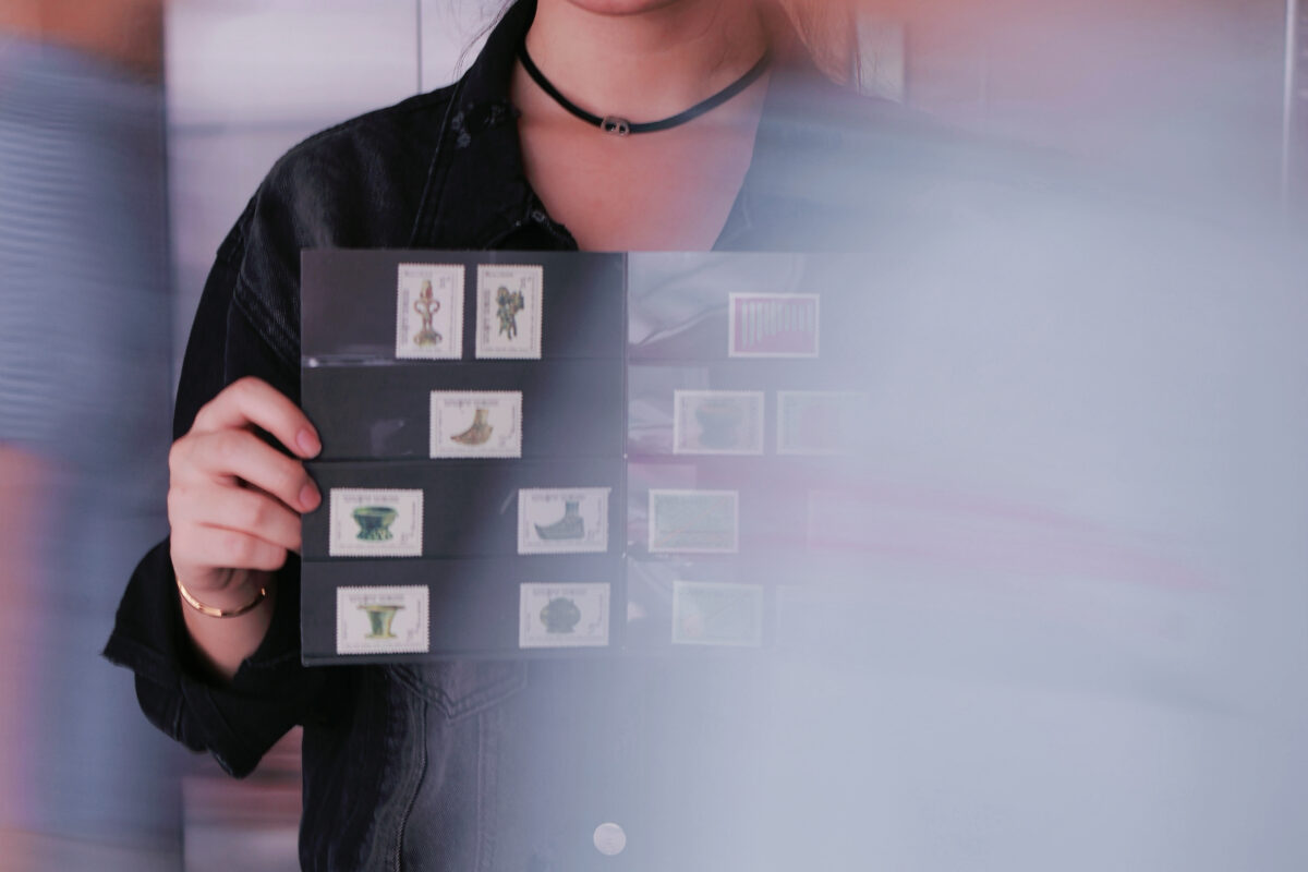 Tác phẩm 2: Kiến chọn một con tem ưng ý. Khoảnh khắc này không chỉ là sự chọn lựa vật phẩm, mà còn là hành vi trân trọng một nếp sống tinh tế, một hình thức giao tiếp thong thả, chân thành đã dần phôi phai.