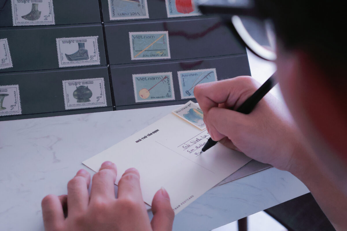 Tác phẩm 4: Cử chỉ dán tem ấy là sự kết nối đầy thi vị giữa quá khứ và hiện tại, đặt một phần hồn cốt lịch sử lên vai trò của sứ giả truyền tin. Trong kỷ nguyên công nghệ số bùng nổ, những con tem mang nặng tình yêu và ký ức này càng trở nên đắt giá, bởi lẽ hiếm ai còn giữ thói quen gửi thư dán tem.