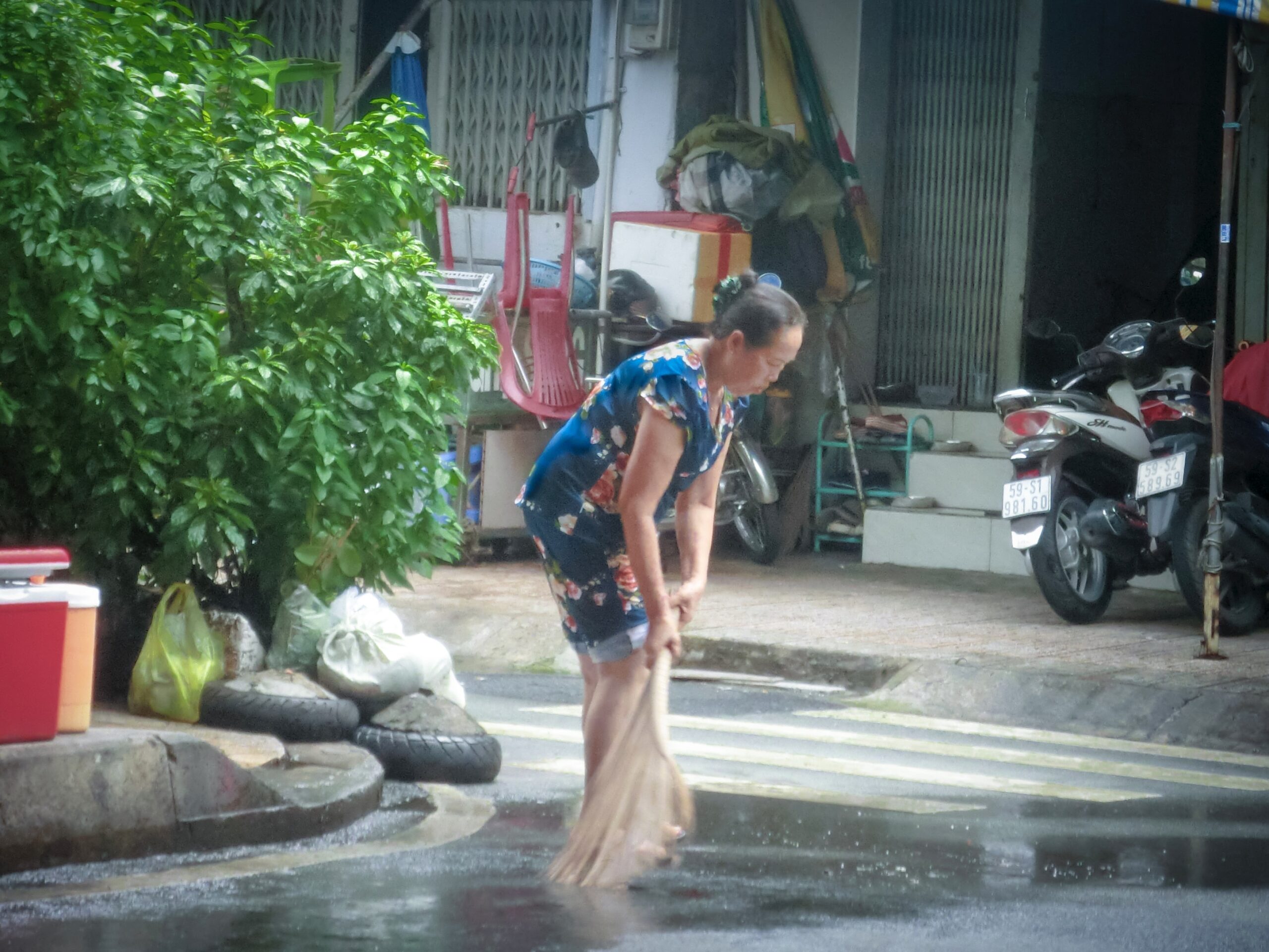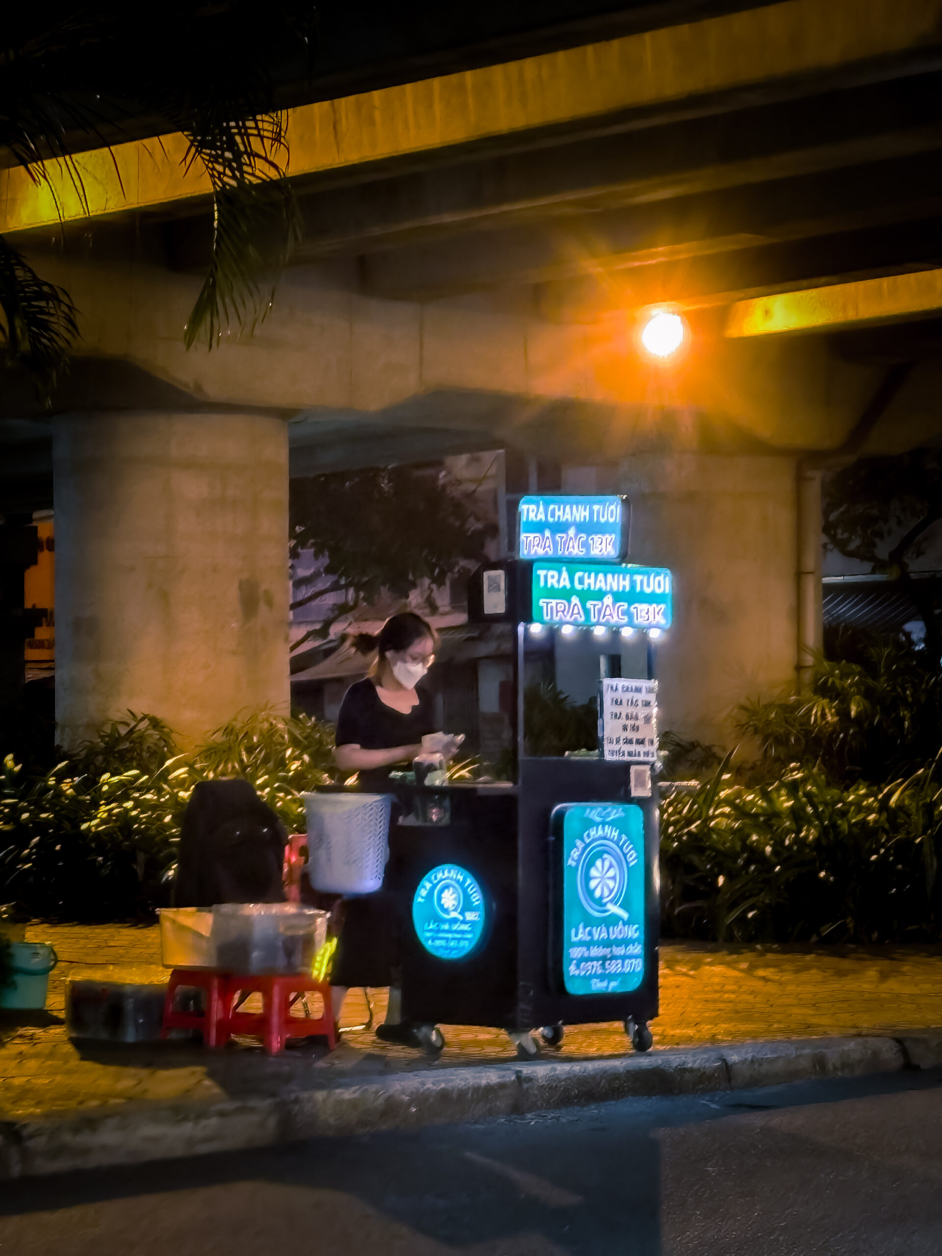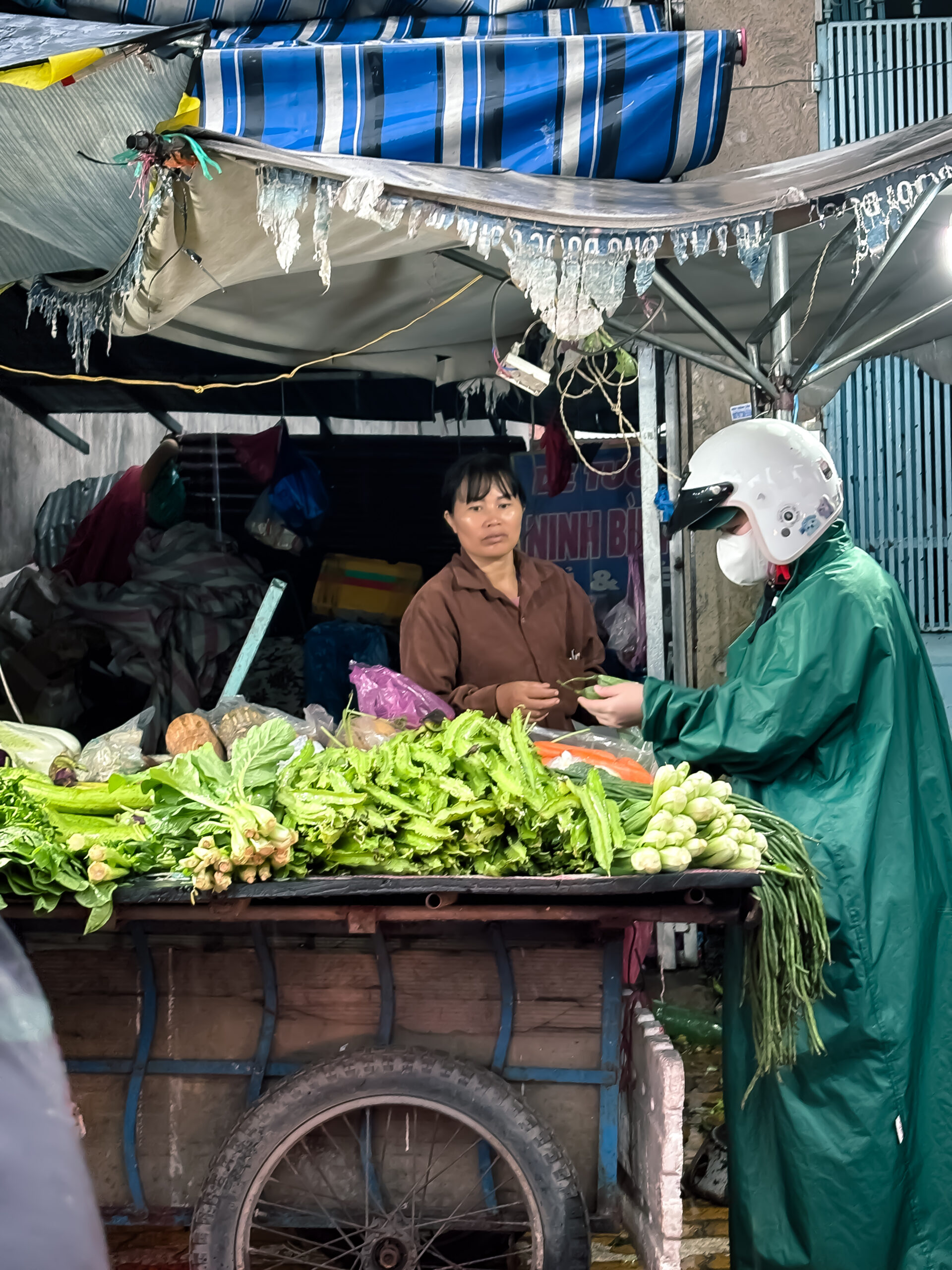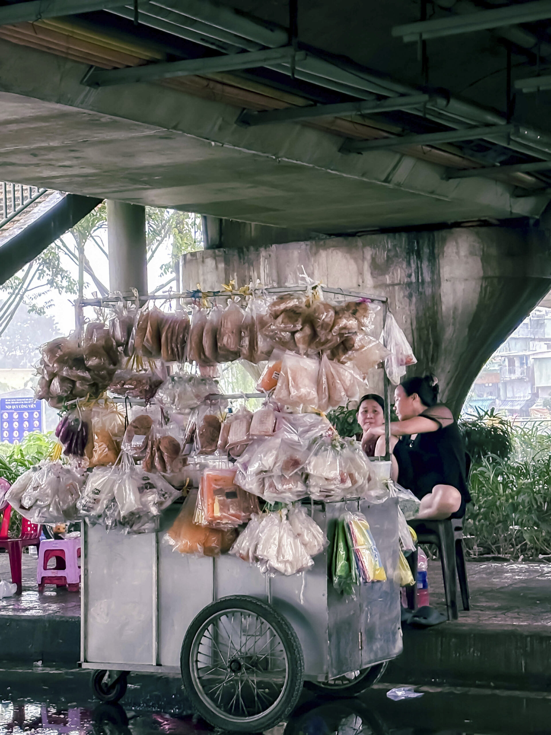 Những gánh hàng rong bên dưới những cây cầu vẫn sáng đèn mỗi tối. Trong tiếng xe chạy ào ào phía trên, họ lặng lẽ bày hàng, nhóm bếp, cắt trái cây, pha ly trà chanh hay gói lại vài túi bánh tráng cho khách qua đường. Không ồn ào, không vội vã, chỉ có mùi khói, tiếng dao chạm thớt và những nụ cười bình dị giữa hơi gió sông. Khu chợ tấp nập giữa cơn mưa rào, tiếng người gọi nhau át cả tiếng mưa rơi lộp bộp trên mái tôn. Những tấm bạt xanh được kéo thấp xuống, nước chảy thành dòng, nhưng ai nấy vẫn mãi bán, mãi mua. Người mua khoác áo mưa, tay cầm rổ nhựa, còn người bán ngồi sau sạp, áo ướt lưng, vẫn nở nụ cười thân quen khi đưa túi rau, bó hành. Ở nơi tưởng như tối tăm ấy, có những con người thắp sáng thành phố bằng chính sự bền bỉ của mình. Họ không cần được ai chú ý, không cần lời ca ngợi. Mỗi ngày trôi qua, chỉ cần còn làm việc, còn bán được vài gói hàng, là còn hy vọng. Giữa những nhịp sống gấp gáp, những gánh hàng rong dưới gầm cầu vẫn là nhịp thở chậm rãi, chân thật và ấm áp nhất của thành phố.