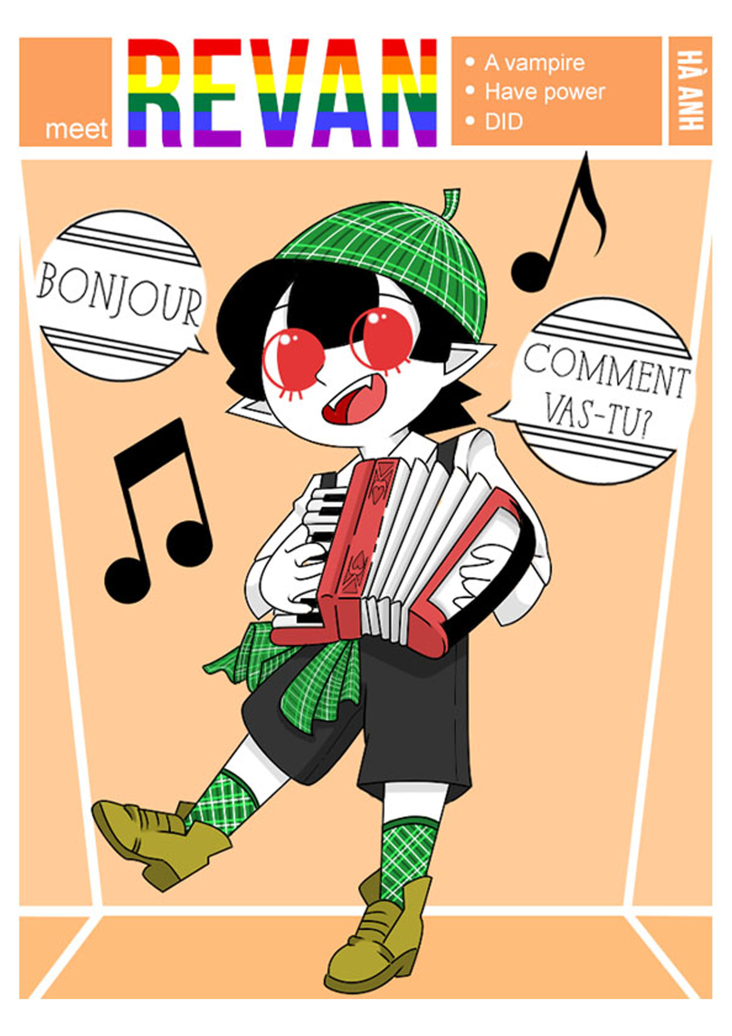 Bức tranh 1 là về cậu bé tên Revan – một ma cà rồng. Đây là một nhân vật tự tạo của mình. Cậu thích rất nhiều màu sắc, thích chơi phong cầm và cậu thuộc trong số những người DID.