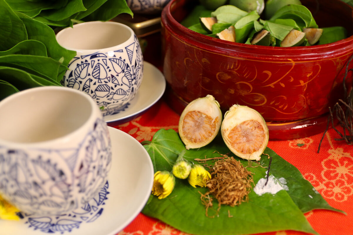 Cận cảnh trầu cau, tách trà và hộp gỗ sơn son trên nền vải đỏ. Màu sắc ấm, gợi không khí trang trọng và thân thuộc của phong tục Việt. Đây là khởi đầu câu chuyện nơi “miếng trầu là đầu câu chuyện” mở ra hành trình kết nối truyền thống trong bộ ảnh.