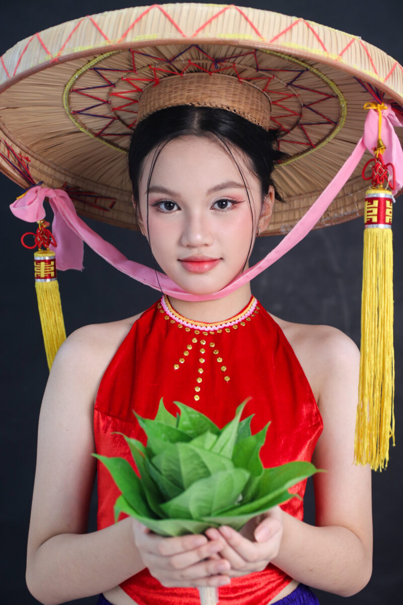 Cô gái trẻ đội nón quai thao, mặc áo yếm đỏ, hai tay nâng bó lá trầu xanh. Ánh nhìn thẳng ống kính, gương mặt nhẹ nhàng và tự tin. Gam màu rực rỡ của áo và nón hòa cùng sắc xanh của trầu tạo nên hình ảnh vừa truyền thống vừa tươi mới tượng trưng cho sự tiếp nối của thế hệ trẻ với giá trị xưa.