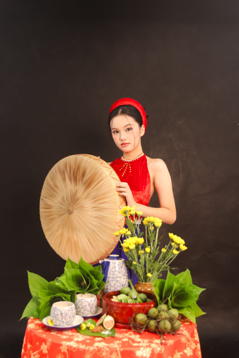 Cô gái trong áo yếm đỏ và váy tím đứng sau bàn trầu cau truyền thống, tay khẽ giữ chiếc nón quai thao. Trước mặt là bàn trầu bày biện lá trầu xanh, cau tươi, ấm chén gốm men lam và bình hoa cúc vàng. Tổng thể bức ảnh gợi khung cảnh thanh nhã, đậm sắc quê, như một góc nhỏ của làng quan họ xưa – nơi sự duyên dáng và lễ nghĩa hòa quyện trong từng chi tiết.