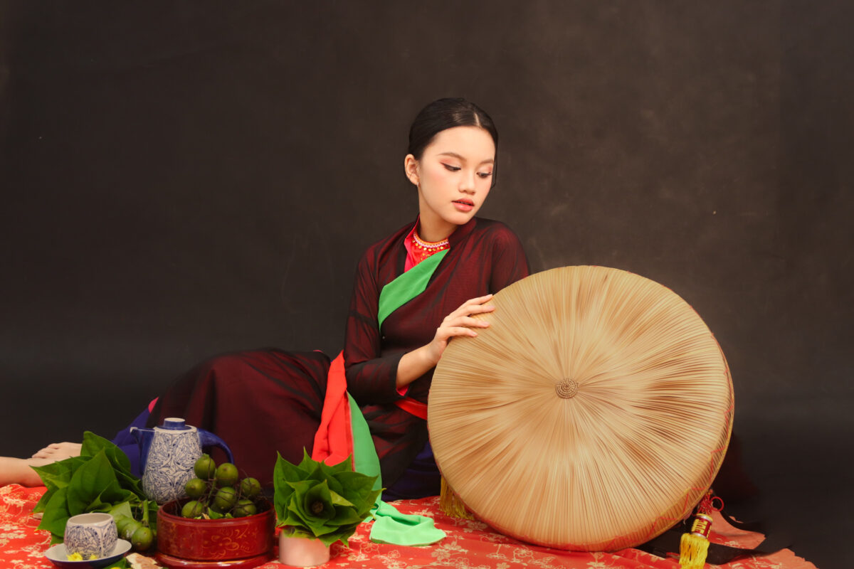 Cô gái trong tà áo tứ thân dịu dàng đặt tay lên chiếc nón quai thao, phía trước là mâm trầu cau được bày biện tinh tế. Ánh mắt cô hướng về chiếc nón, gợi cảm giác trầm tư và hoài niệm, như thể đang lắng nghe tiếng vọng của những làn quan họ xưa.