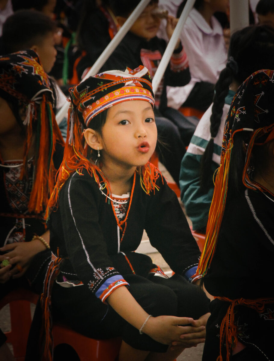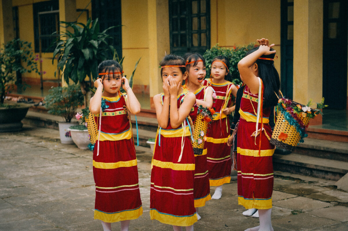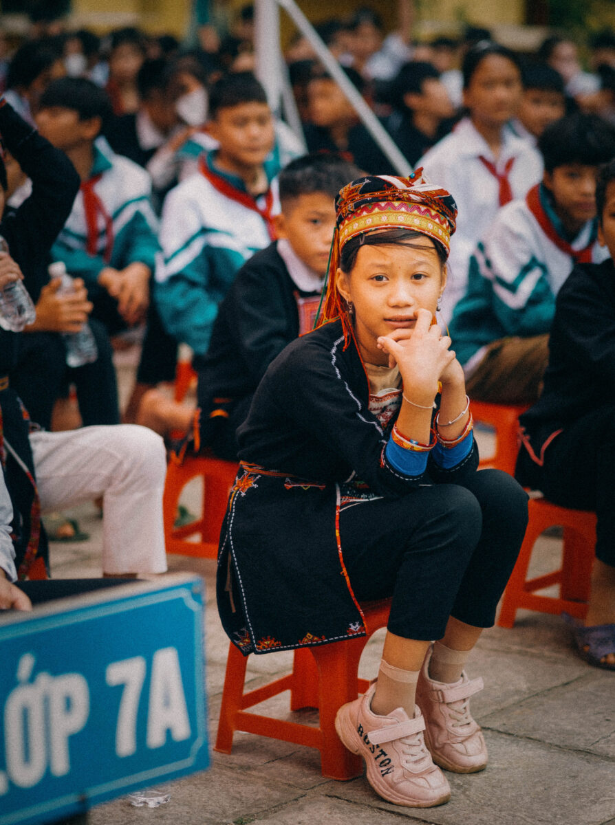 Bức ảnh ghi lại các em bé với tuổi thơ vùng cao trong thời đại mới – nơi mà văn hóa truyền thống vẫn song hành cùng sự phát triển, giáo dục và hội nhập. Hình ảnh được chụp tại Trường Tiểu học & THCS Trung Tâm – Yên Bái ghi lại khoảnh khắc các em nhỏ người dân tộc thiểu số trong ngày hội của trường. Những bộ trang phục truyền thống rực rỡ được khoác lên cùng tiếng cười hồn nhiên, ánh mắt ngây thơ và niềm háo hức của tuổi học trò. Không chỉ những thể còn, đằng xa xa là những bộ đồng phục của người miền xuôi xuất hiện trong khung hình. Tất cả hòa quyện thành một bức tranh về sự giao thoa giữa truyền thống và hiện đại. Giữa nhịp sống hiện đại, nơi mà công nghệ và đô thị đang len lỏi đến từng bản làng, những nụ cười, ánh mắt và trang phục của các em nhỏ vùng cao vẫn lưu giữ nguyên vẹn bản sắc văn hóa truyền thống.