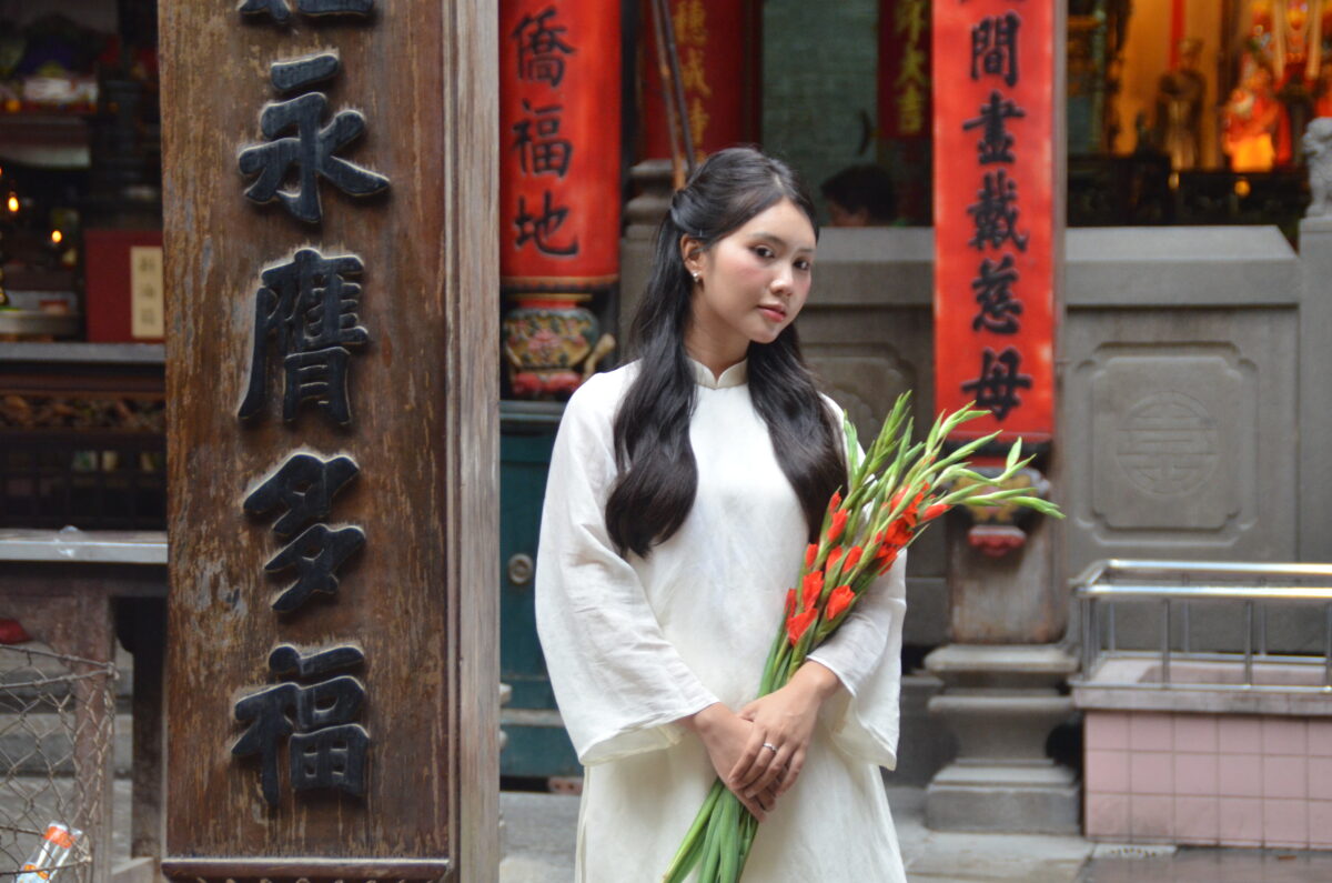 Tác phẩm 4-5: Những hình ảnh ghi lại khoảnh khắc đời thường nhưng đầy ý nghĩa tại một ngôi miếu cổ kính, nơi người dân đến thắp hương, dâng hoa và cầu nguyện trong không gian linh thiêng. Từ người đàn ông lặng lẽ chắp tay trước nén hương nghi ngút khói, đến thiếu nữ dịu dàng trong tà áo dài trắng cầm bó hoa lay ơn, tất cả đều toát lên vẻ đẹp của sự thành tâm và nét văn hóa truyền thống sâu sắc. Không gian miếu với câu đối đỏ, cột gỗ khắc chữ và bàn thờ trang nghiêm tạo nên một bức tranh hài hòa giữa con người và tín ngưỡng.