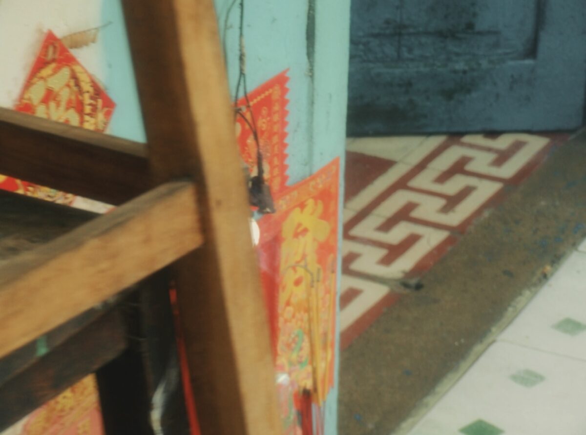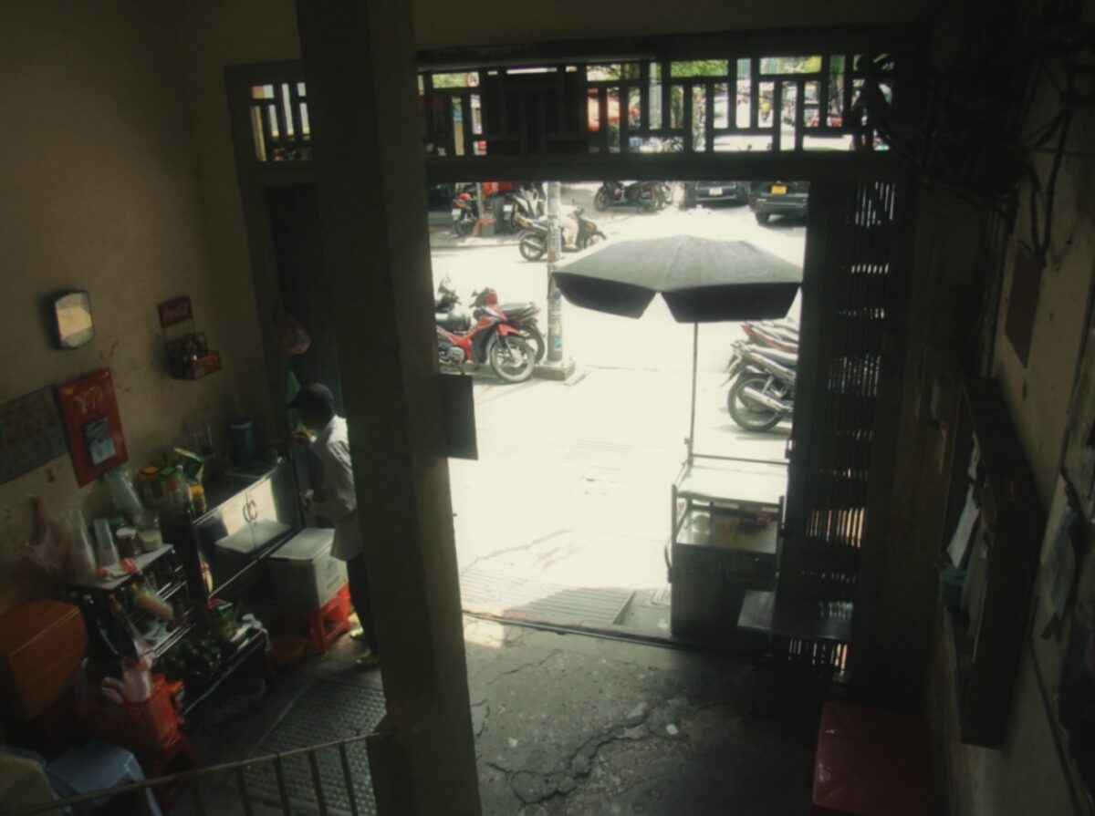 Cuộc sống len lỏi trong từng góc khuất. Chiếc xe đạp cũ gác nghiêng bên lan can cầu thang, giỏ xe trống rỗng, như một người bạn đường lặng lẽ của bao thế hệ cư dân. Sắc đỏ rực rỡ của những tấm dán trang trí Tết còn sót lại trên tường, đối lập với mảng màu xanh dương cũ kỹ. Dưới tầng trệt, bóng người đứng nấu nướng, góc bán hàng tạp hóa nhỏ nhìn thẳng ra con phố ngập xe máy.