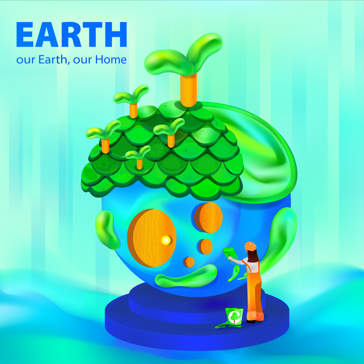 Tác phẩm được thể hiện thông qua hình ảnh cách điệu Trái Đất như một ngôi nhà. Mái nhà được phủ những mầm xanh và con người đang sơn trang trí cho ngôi nhà bởi màu sơn mang chất liệu “xanh”. Trái Đất chính là ngôi nhà của chúng ta, tác phẩm truyền tải thông điệp: “ Hãy làm đẹp cho Trái Đất như cách chúng ta chăm chút cho mái ấm của chính mình”.