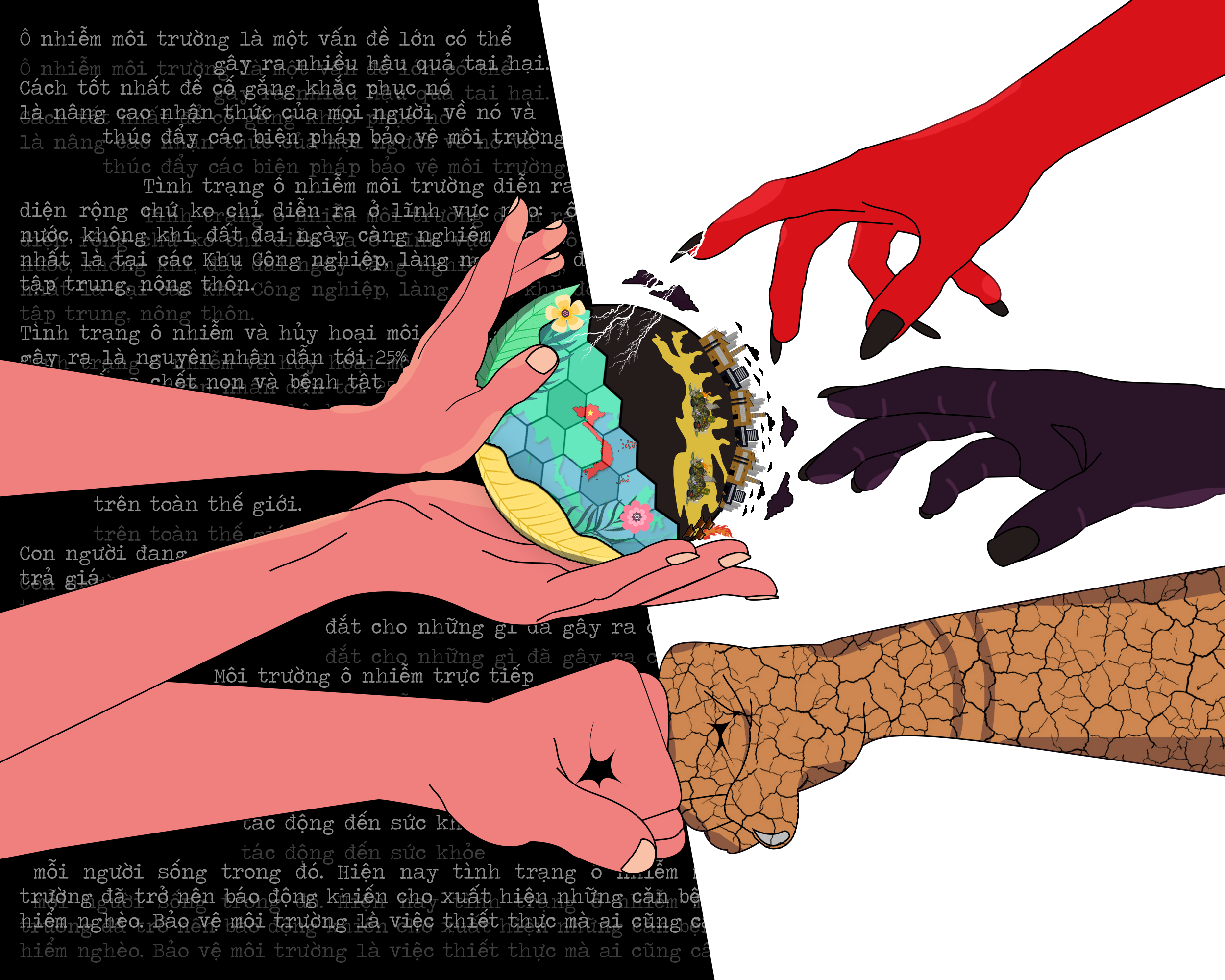 Không biết bạn có từng đặt câu hỏi giống mình không? “Thế giới này có thể sẽ tươi đẹp hơn khi không có sự xuất hiện của bàn tay con người?”. Vấn đề môi trường bị ô nhiễm ảnh hưởng đến cuộc sống của chúng ta không phải là một vấn đề mới! Cũng giống như hình thiết kế bạn đang thấy vậy, vẫn bố cục và các chi tiết quen thuộc. Sự biến đổi của môi trường đã ảnh hưởng rất lớn tới hành tinh này. Tin tức về môi trường cũng luôn thường xuyên cập nhật dày đặt thông qua tin tức báo đài từ vĩ mô: Ô nhiễm đất, ô nhiễm nước, ô nhiễm trắng, hạn hán, sóng thần, thiên tai đến cái vi mô nằm ngay trước mắt chúng ta mỗi ngày là sự xuất hiện của rác thải ngay nơi ta sinh sống, học tập, vui chơi, từ chiếc ngăn bàn cho đến bên vệ đường,… Bàn tay ta làm nên tất cả! Với đôi bàn tay con người, ta tạo nên những công trình vĩ đại, tạo nên nhiều điều tốt đẹp phục vụ cho chính chúng ta và san sẻ tình yêu thương đến các cá thể sống, giống loài khác. Chúng ta biết ơn đất mẹ, nâng niu, chăm sóc màu xanh. Nhưng cũng từ bàn tay con người mà nguồn tài nguyên thiên nhiên bị khai thác cạn kiệt, hệ sinh thái động – thực vật có những loài gần như bị tuyệt chủng. Chúng ta từ giống loài thấp bé, đấu tranh với thiên tai tự nhiên, nay đã vươn lên đỉnh muôn loài. Thiên nhiên đã phải xoay chuyển theo chúng ta. Biến đổi khí hậu diễn ra do chúng ta và ta lại đấu tranh với chính mình… Chúng ta ghét những điều xấu xa nhưng có khi chúng ta lại vô tình hoặc cố ý trở thành quỷ dữ. Ta gìn giữ, bảo vệ quả đất xanh nhưng có khi chính chúng ta là người dâng tặng, xem Trái Đất là hòn bi và bắn nó vào hố đen của lòng tham và sự tuyệt diệt. Vậy thế giới này sẽ tươi đẹp hơn khi không tồn tại loài người? E là không! Sự xuất hiện của con người chính là điều hiển nhiên phải xảy đến đối với một hành tinh có sự sống, có tiến hóa. Việc giáo dục và các thông điệp mang tính lan tỏa là điều cực kỳ quan trọng, tiên phong, cần nhân rộng thêm nhiều hơn nữa cùng với các hành động tích cực, thực sự có ích khác. Chúng ta đang nhận ra sai lầm của bản thân mình và thời gian cho việc khắc phục vẫn còn. Hãy cùng nắm tay bảo vệ ngôi nhà chung, chúng ta nhé!