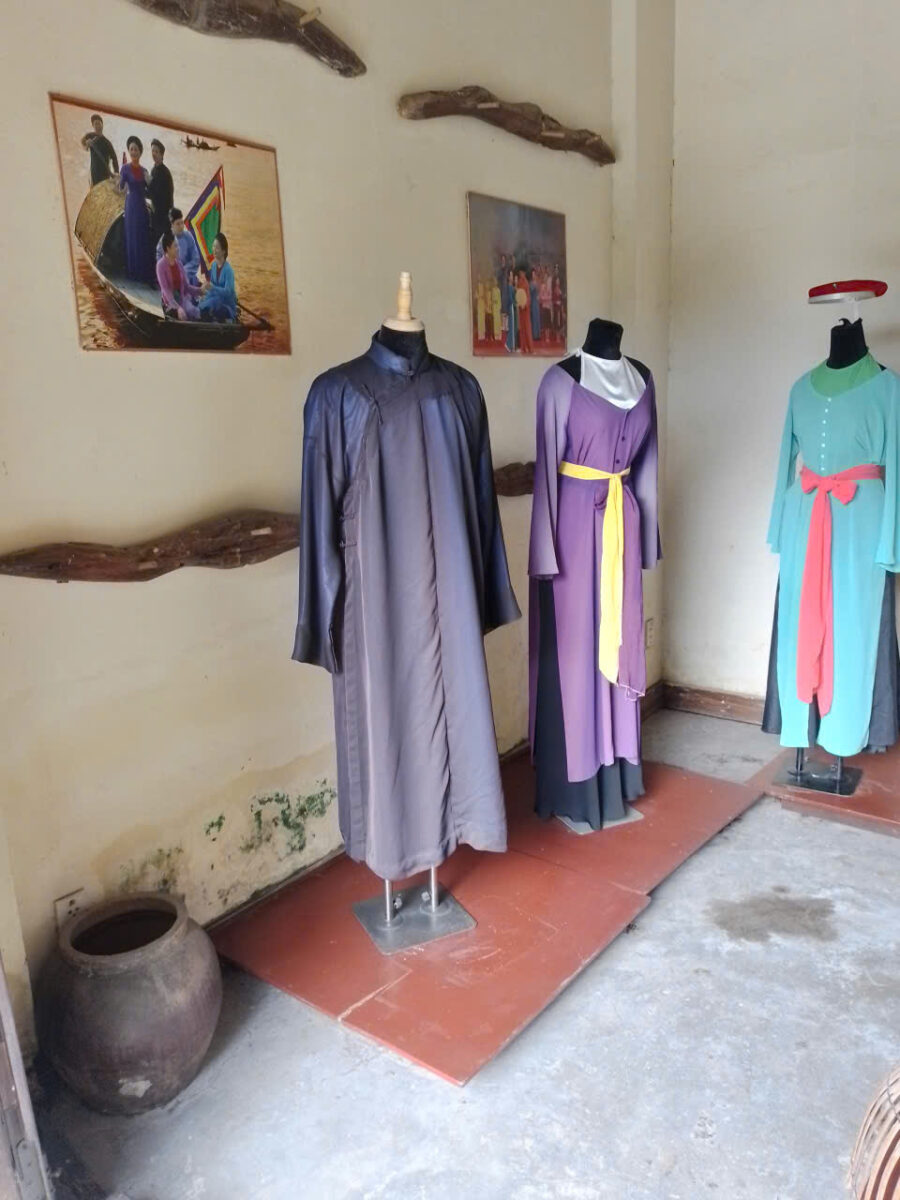 Tác phẩm 2: Ba bộ áo dài trên mannequin trong phòng trưng bày, mỗi bộ mang sắc thái riêng: đen giản dị, tím thanh lịch, xanh ngọc nổi bật. Bối cảnh mộc mạc, gợi nhớ về nét đẹp xưa.