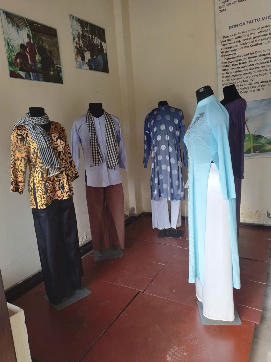 Tác phẩm 3: Năm mannequin khoác lên mình các kiểu áo dài và trang phục truyền thống đa dạng. Phía sau là poster về “Đờn ca tài tử”, kết nối thời trang với âm nhạc dân gian miền Nam.