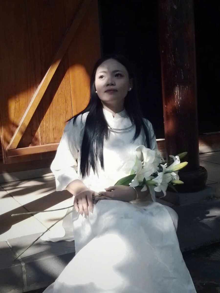 Tác phẩm 4: Người mặc áo dài trắng ngồi bên hiên gỗ, tay cầm bó hoa loa kèn. Ánh nắng nhẹ nhàng tạo nên khung cảnh đầy chất thơ và hoài niệm.