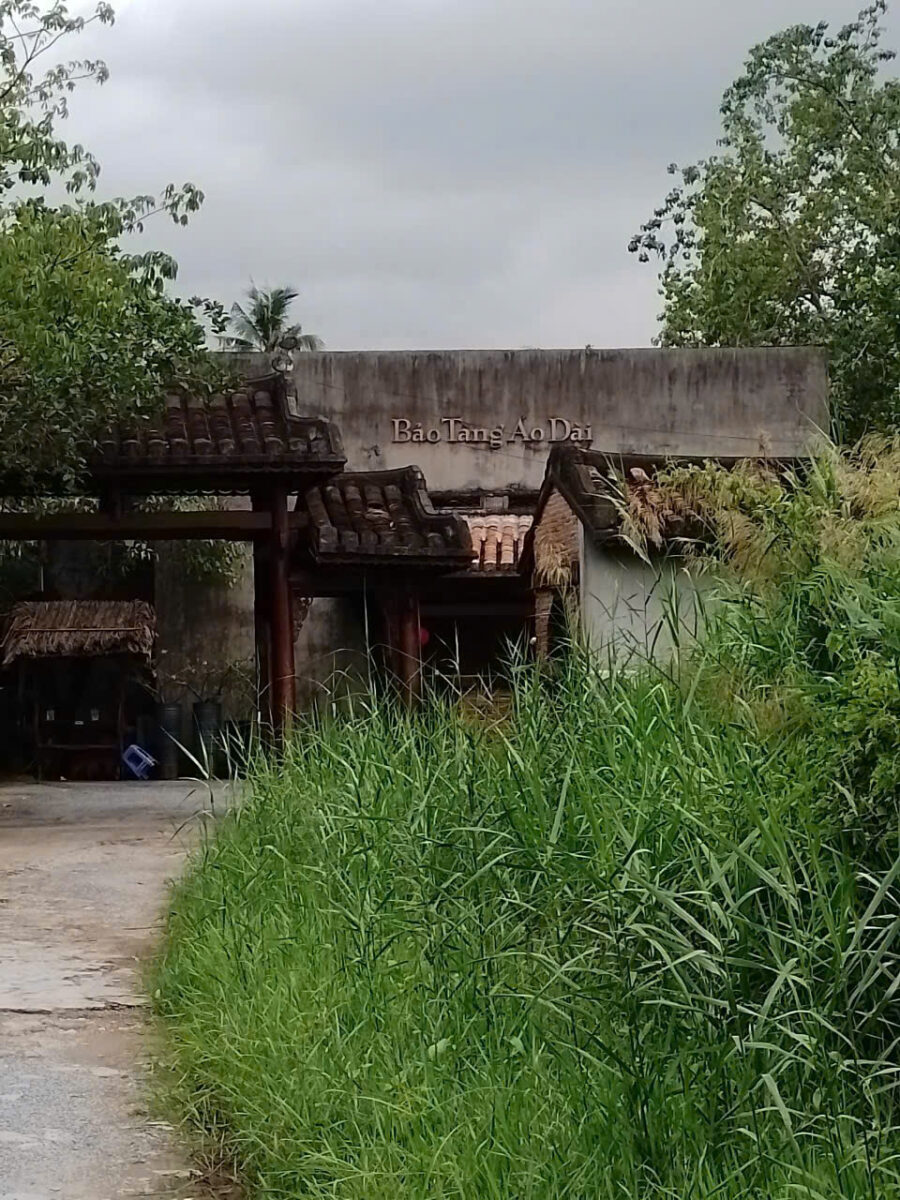 Tác phẩm 5: Góc nhìn từ xa về ngôi nhà truyền thống với biển hiệu “Bảo Tàng Áo Dài”, ẩn hiện sau cây cỏ và mái ngói xưa. Một lát cắt của kiến trúc và văn hóa Việt Nam giữa thiên nhiên.