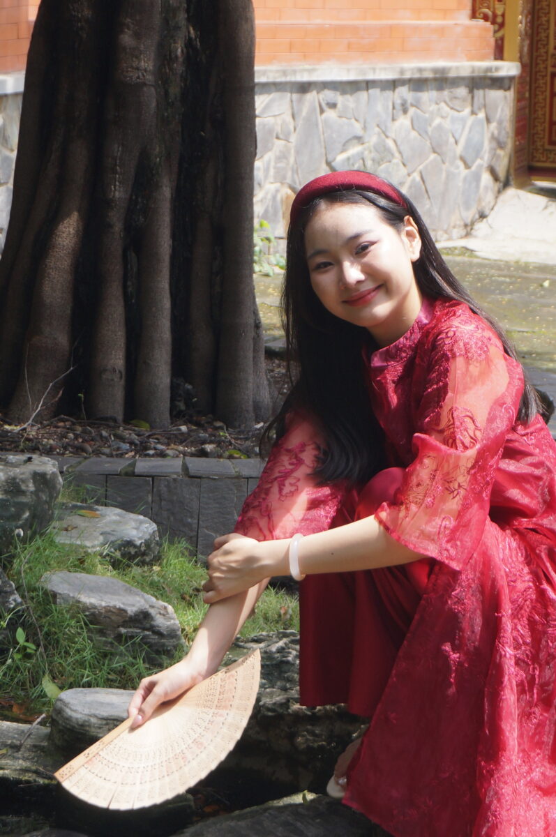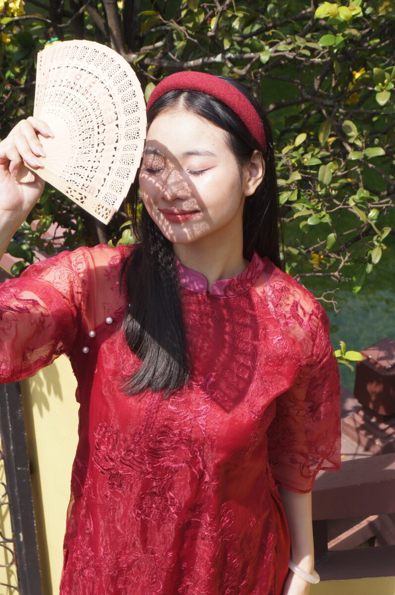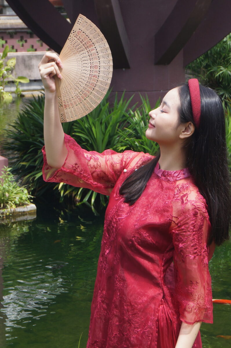 Hương Sắc Việt Nam là sự hòa quyện tinh tế giữa vẻ đẹp duyên dáng, rạng ngời của người thiếu nữ và hồn cốt truyền thống của đất Việt. Khoác lên mình tà áo dài đỏ thắm với chất liệu ren tinh tế, nhân vật chính tựa như một đóa sen kiêu sa, tỏa sáng giữa không gian cổ kính của cây cổ thụ và hồ cá Koi. Chiếc quạt nan trở thành điểm nhấn duyên dáng, tôn lên nét đẹp thanh lịch, Á Đông. Tác phẩm tôn vinh sự tươi mới của tuổi trẻ đồng thời gìn giữ trọn vẹn vẻ đẹp văn hóa sâu sắc của phụ nữ Việt Nam.